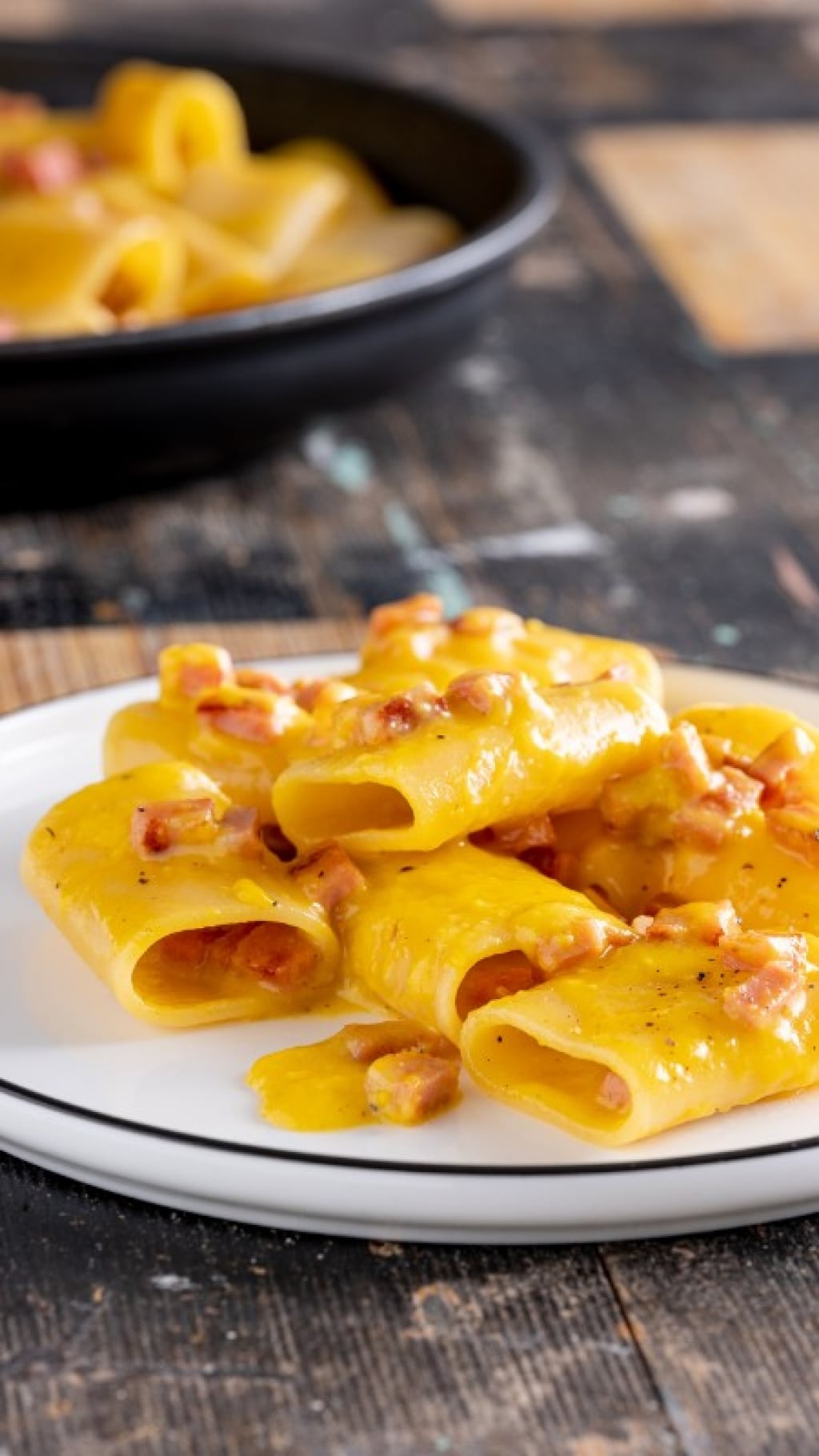 Scolate i paccheri al dente (1 minuto prima del tempo di cottura indicato sulla confezione), trasferiteli nel tegame con la mortadella e fateli insaporire. Abbassate il fuoco al minimo e unite la crema di uova, versandola a filo e continuando a mescolare in modo che le uova non si rapprendano ma rimangano cremose.