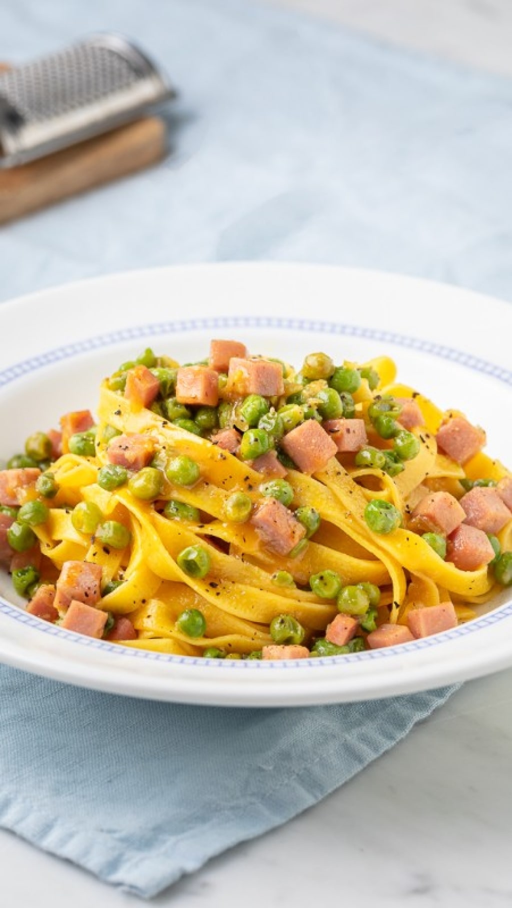 Le fettuccine alla papalina con piselli sono un piatto di pasta facile e sostanzioso. Cremose e arricchite da prosciutto cotto, queste fettuccine all'uovo sono una versione altrettanto golosa di un piatto tipico della cucina romana.