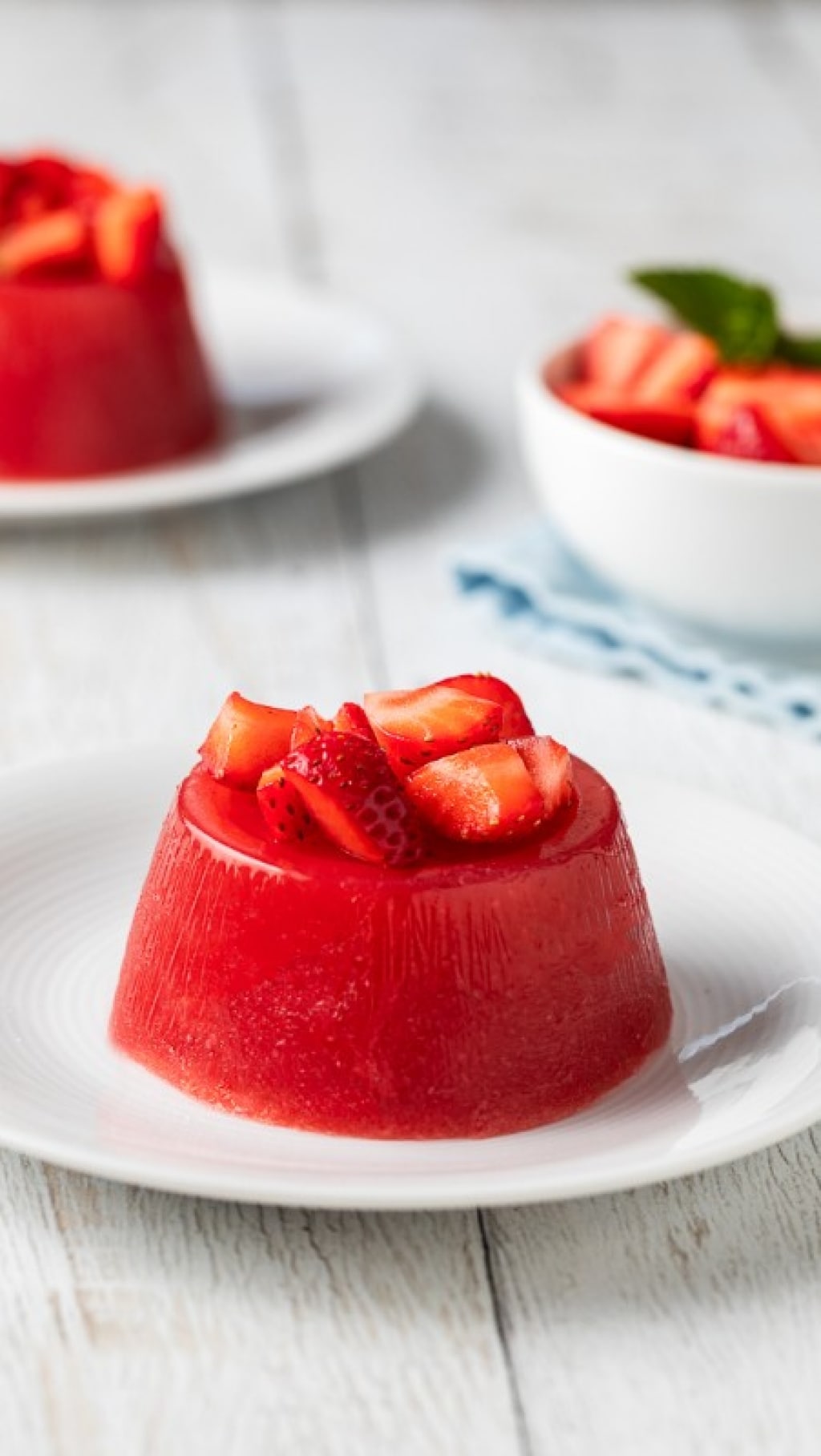 Al momento di servire sformate la gelatina di fragole, decorate con fragole a pezzetti, menta fresca se gradita e servite.