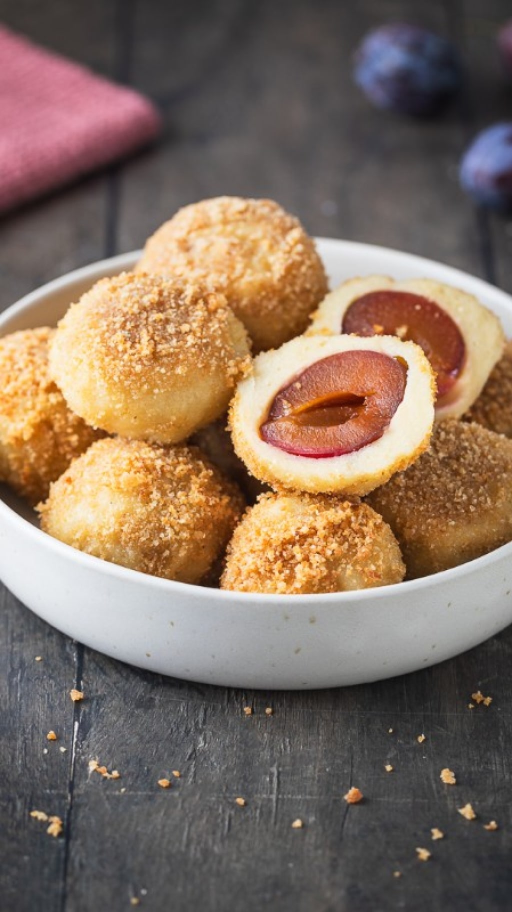 Si tratta di grossi gnocchi di patate, preparati come da tradizione con patate schiacciate, farina, uova e poco sale, farciti con mezza prugna fresca e conditi con burro fuso e pangrattato aromatizzato alla cannella.