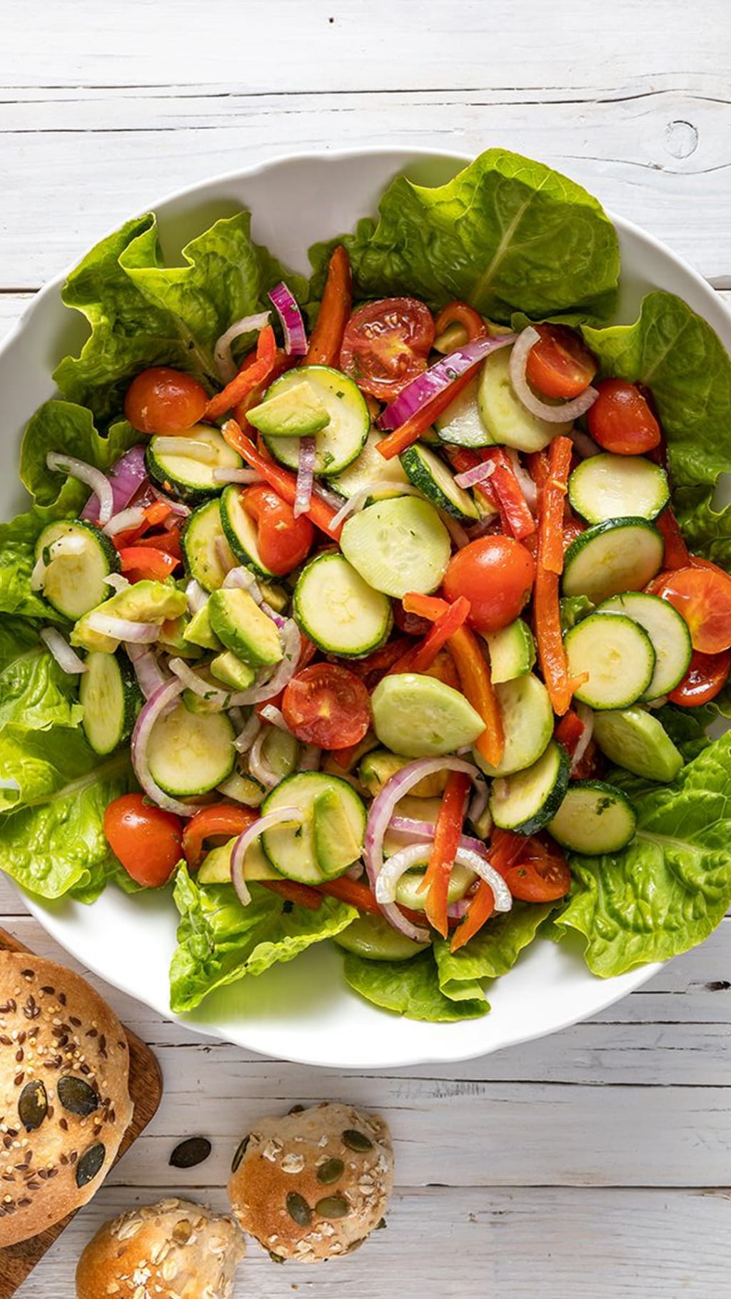 Ci sono i cetrioli e i pomodorini, il peperone e le zucchine, che devono essere piccole e freschissime per assicurare dolcezza e turgidezza. E poi ancora l'avocado, la cipolla di Tropea e la lattuga romana: l'insalata estiva verde e rossa al lime è un mix di verdura reso appetitoso da una profumatissima vinaigrette.