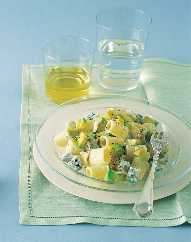 Dividete gli avocadi a metà, snocciolateli, estraete la polpa, tagliatela a dadini e uniteli alla crema di gorgonzola. Lessate i mezzi rigatoni in abbondante acqua salata, scolateli, passateli sotto un getto d’acqua fredda, versateli in un’insalatiera, conditeli con la crema, mescolate e servite.