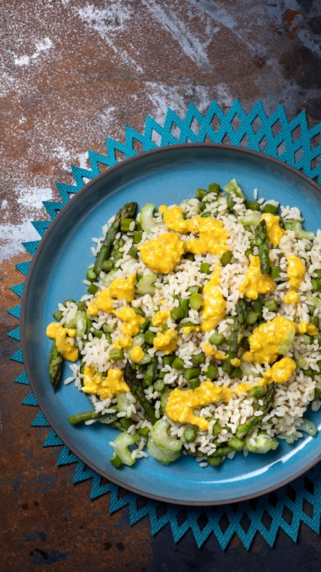 In una ciotola emulsionate la senape con il succo di limone, poco olio, sale e pepe a piacere. In una boule riunite il riso con gli asparagi e il sedano a pezzetti.