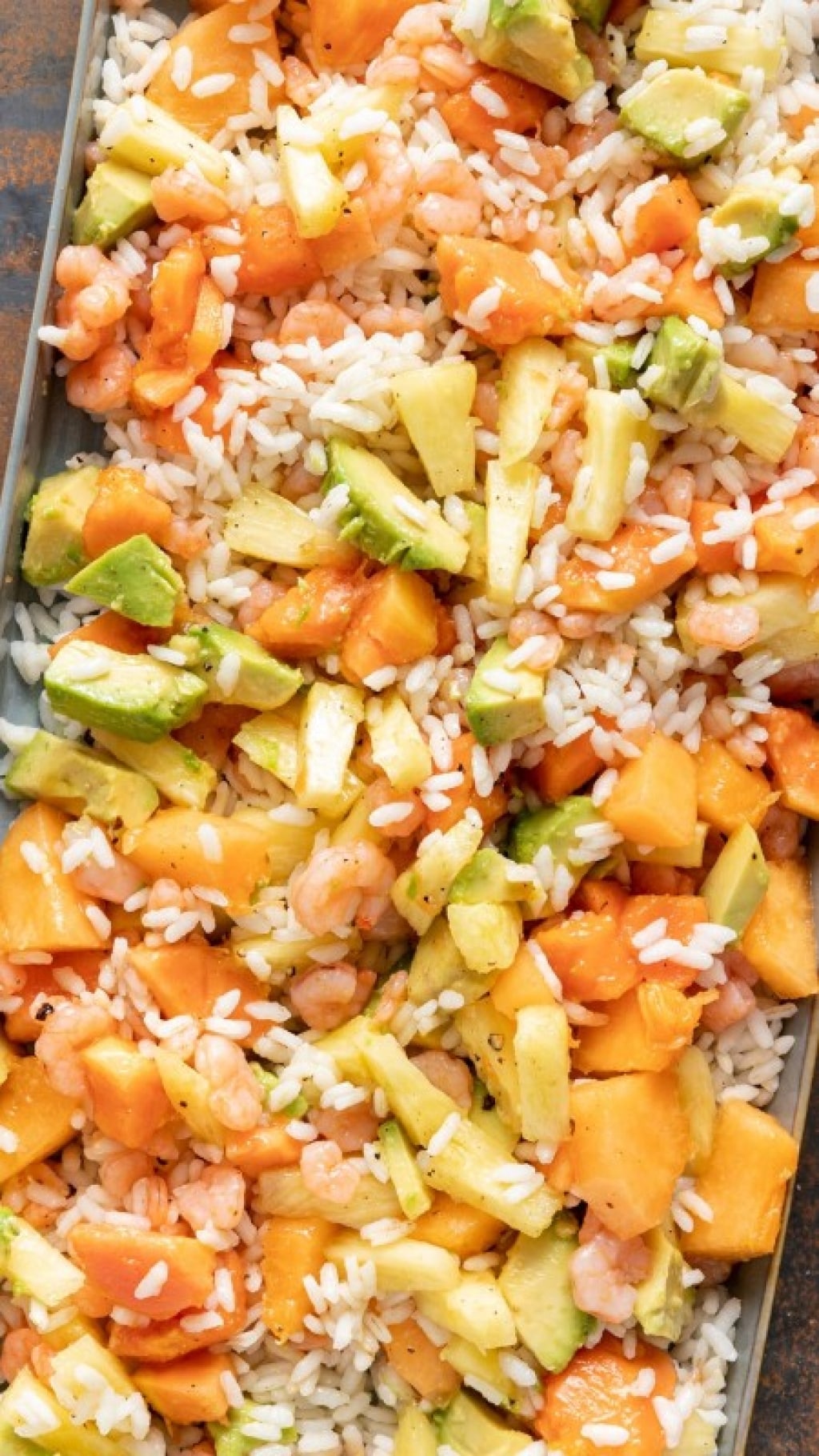 L’insalata di riso è il piatto estivo per eccellenza. Semplice da preparare, si può personalizzare con una infinità di ingredienti, come in questa insalata di riso esotica, che non solo richiama la bella stagione, ma ci fa immaginare di essere catapultati in una spiaggia tropicale. Una ricetta facile e allo stesso tempo creativa, grazie al fresco mix di gamberetti, ananas, papaya, avocado e melone.
