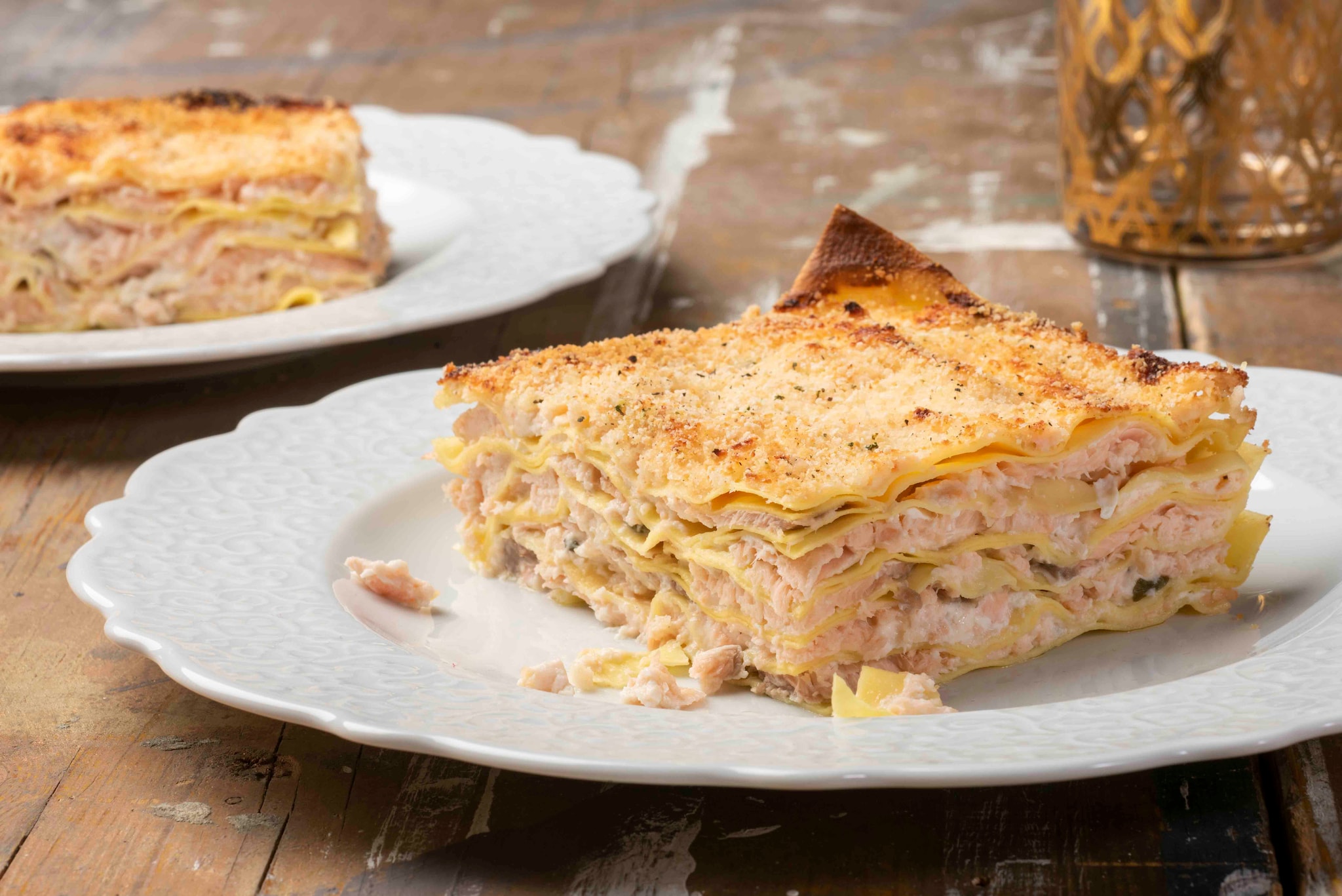 Trascorso il tempo di cottura, sfornate le lasagne salmone e robiola e fatele assestare per 5 minuti prima di servire.