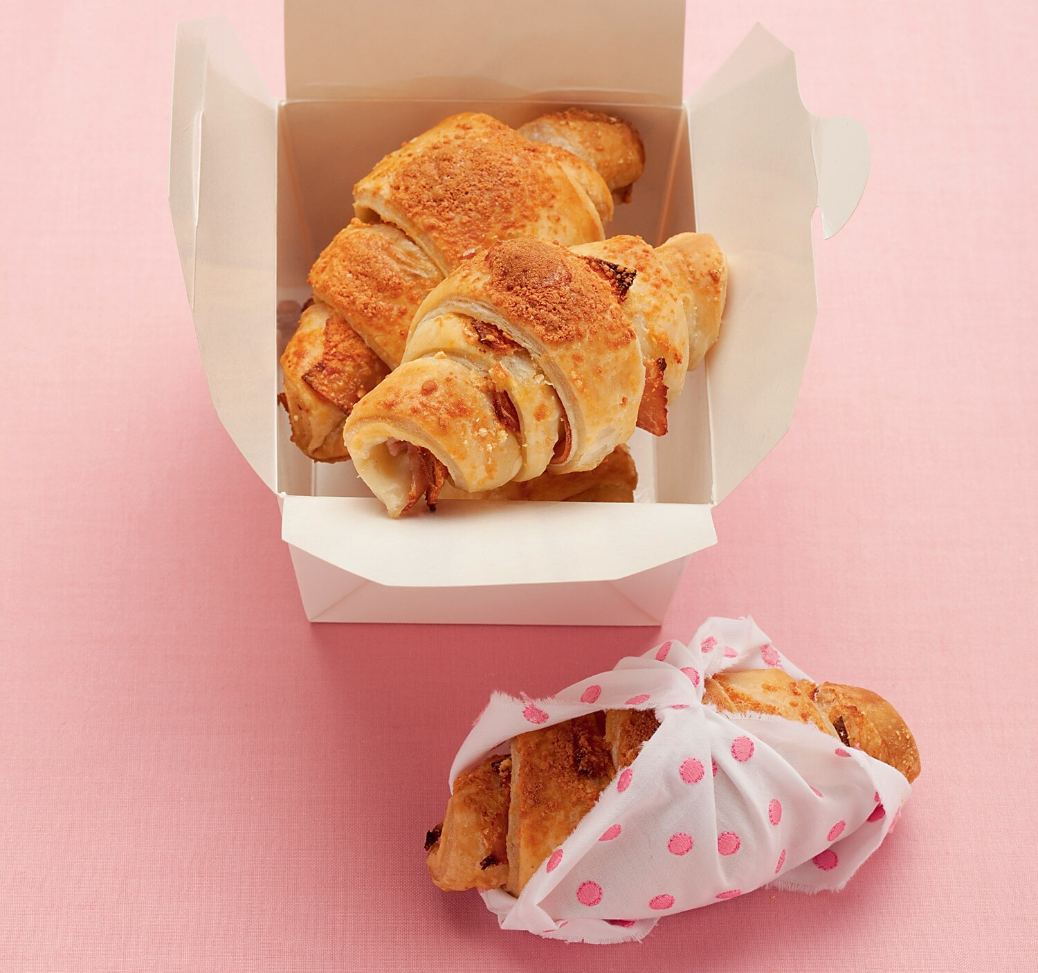 Disponete il prosciutto e una scaglietta di Grana Padano verso la base del triangolo e arrotolate la pasta intorno al ripieno partendo dalla base stessa. Inumidite leggermente la punta con una goccia di acqua e fatela aderire alla pasta sottostante.