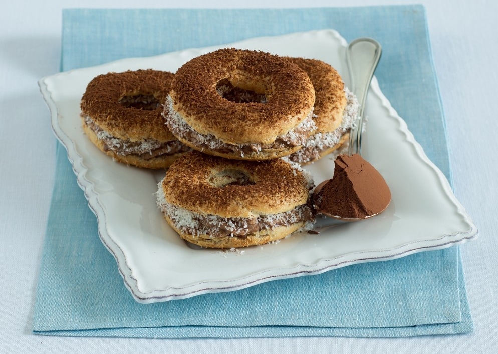 Montate la panna e gli albumi e amalgamateli al composto di cioccolato. Tagliate le ciambelline a metà, farcitele con la mousse e cospargetele con il cocco rimasto. Tenetele in frigo fino al momento di servire e, a piacere, cospargetele con poco cacao in polvere.