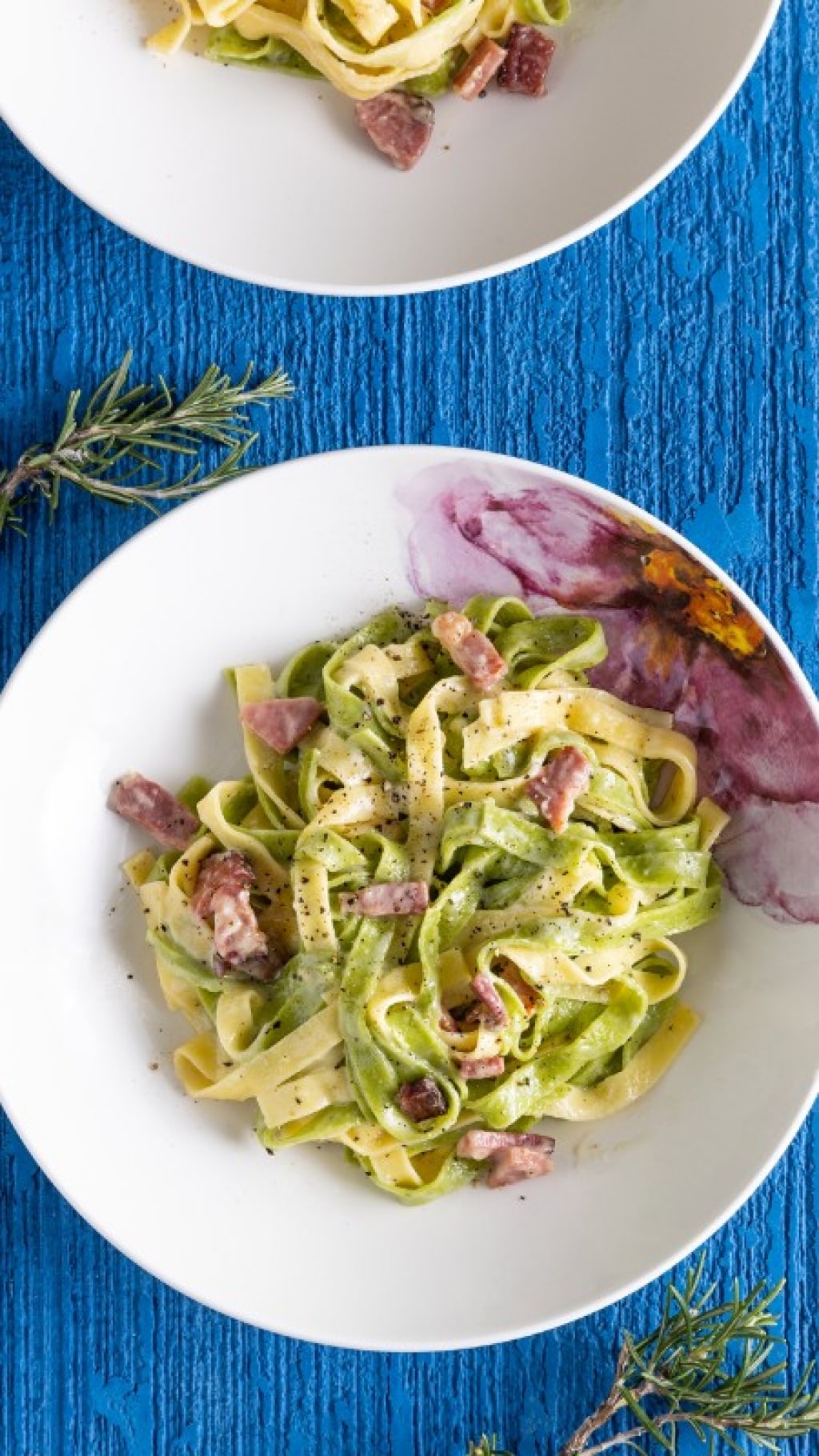 Le tagliatelle paglia e fieno in questa versione con panna e speck sono un primo piatto gustoso, facile e veloce, che regala un bel gioco cromatico grazie al contrasto di colore tra le tagliatelle verdi e bianche.