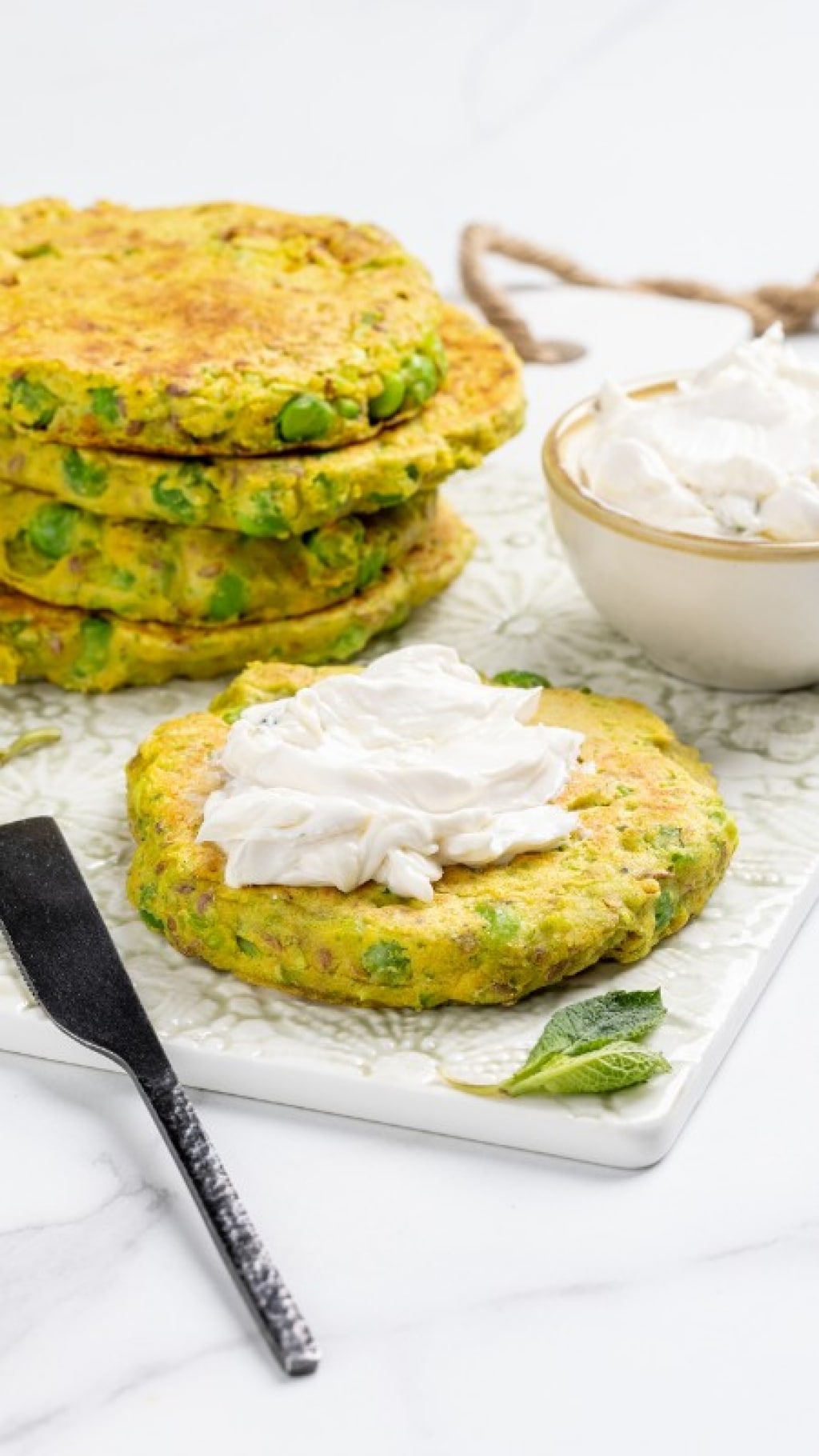 Per accompagnare i pancake, mescolate il Philadelphia vegetale insieme a qualche cucchiaio di olio alla menta tenuto da parte, dunque servite i pancake vegani ceci e piselli con la crema profumata di formaggio spalmabile.