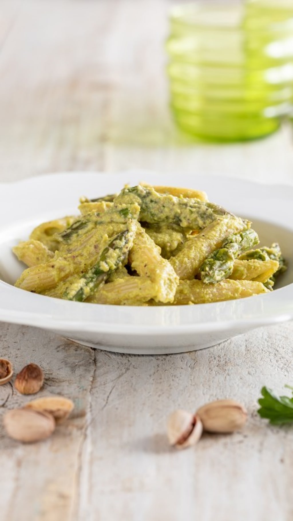 Si tratta di una ricetta dal sapore molto delicato, che prevede di sbollentare gli asparagi e poi frullarli con l'aggiunta di pistacchi, parmigiano reggiano e scorza di limone. Una combinazione di sapori per una salsa cremosa e profumata.