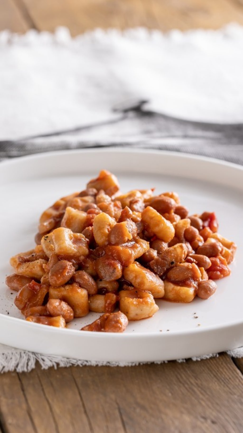 Di tanto in tanto date una mescolata e unite poca acqua calda, o brodo vegetale, se necessario. A fine cottura aggiustate di sale un pizzico di pepe. Quando il sugo di fagioli sarà pronto, portate a ebollizione abbondante acqua salata e lessatevi i pisarei per pochi minuti, giusto il tempo che affiorino in superficie. Prelevateli con una schiumarola, scolandoli bene e trasferiteli direttamente nel tegame con il condimento.