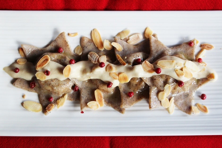 Anche in occasione delle feste natalizie il radicchio non può mancare, trasformato nel ripieno di un semplice raviolo, racchiuso in una sfoglia un po’ rustica di farro e saraceno, servito con uno zabaione salato, mandorle tostate e pepe rosa.
