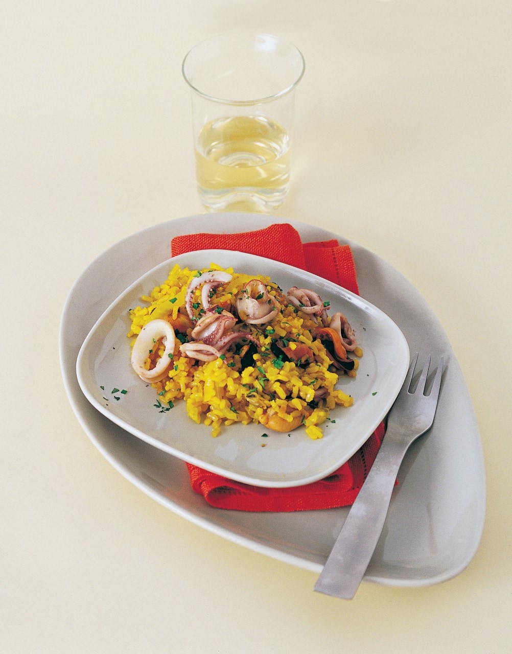 1 Lavate molto bene cozze e vongole sotto l’acqua corrente, raccoglietele in una padella con un cucchiaio d’olio e uno d’acqua, ponete a fuoco vivo. Quando le valve sono dischiuse (scartate quelle che non si sono aperte) togliete loro i molluschi e tenete da parte. Eviscerate i calamaretti, tagliateli a piccoli pezzi e fateli saltare per alcuni minuti in una padella senza condimento; quando tutto il liquido è evaporato, insaporiteli con un filo d’olio, coprite e tenete da parte.