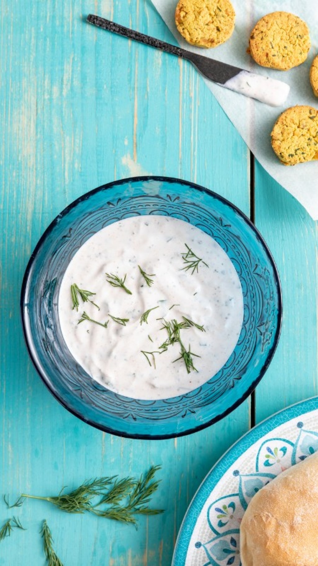 Cominiciate a preparare la salsa allo yogurt mescolando a mano in una ciotola lo yogurt greco fino ad ammorbidirlo, poi unite le erbe aromatiche tritate (tenete da parte qualche ciuffo di aneto per la guarnizione). Riducete l'aglio a pomata con un pizzico di sale, quindi aggiungetelo allo yogurt, unite il succo di limone e mescolate ancora.