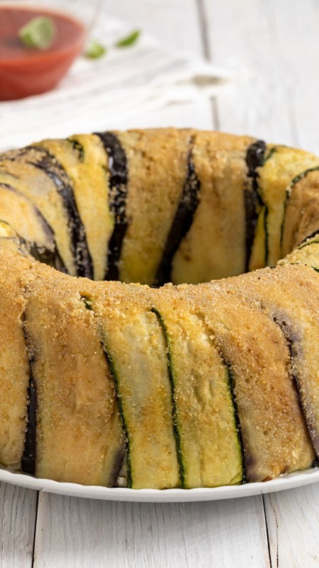 Spennellate d'olio uno stampo a ciambella da 26 cm di diametro e cospargetelo con pangrattato. Foderatelo quindi con le fettine di melanzane e zucchine, alternandole l'una con l'altra. Lasciatele fuoriuscire dai bordi (come nell'immagine).