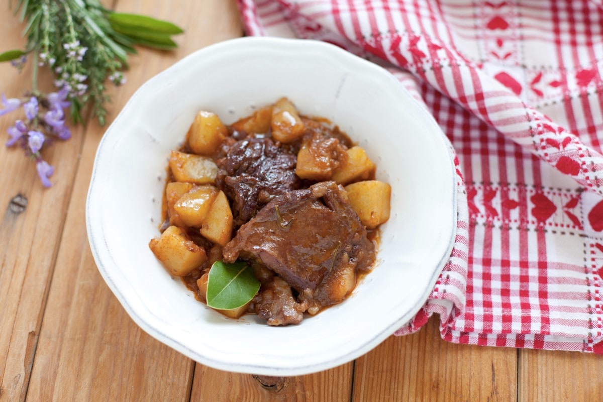 Trascorso questo tempo sbuccia le patate, tagliale a cubetti di 3 cm e uniscile all’agnello. Prosegui la cottura per altri 20 minuti, aggiungendo eventualmente altro brodo se necessario. Aggiusta di sale e pepe e servi subito.