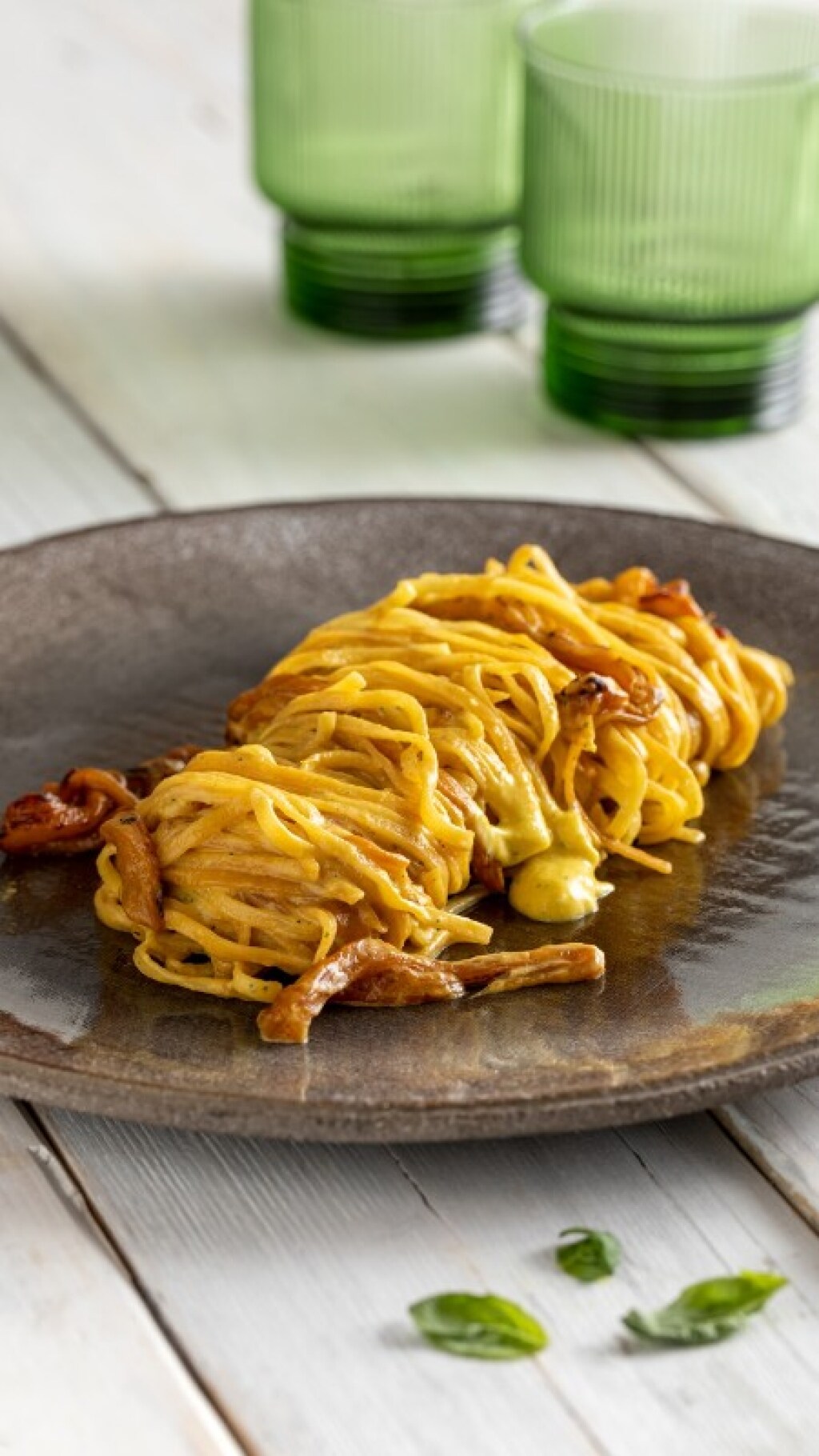 Suddividete i taglierini con mascarpone e peperoni nei singoli piatti e servite subito completando con qualche fogliolina di basilico a piacere.