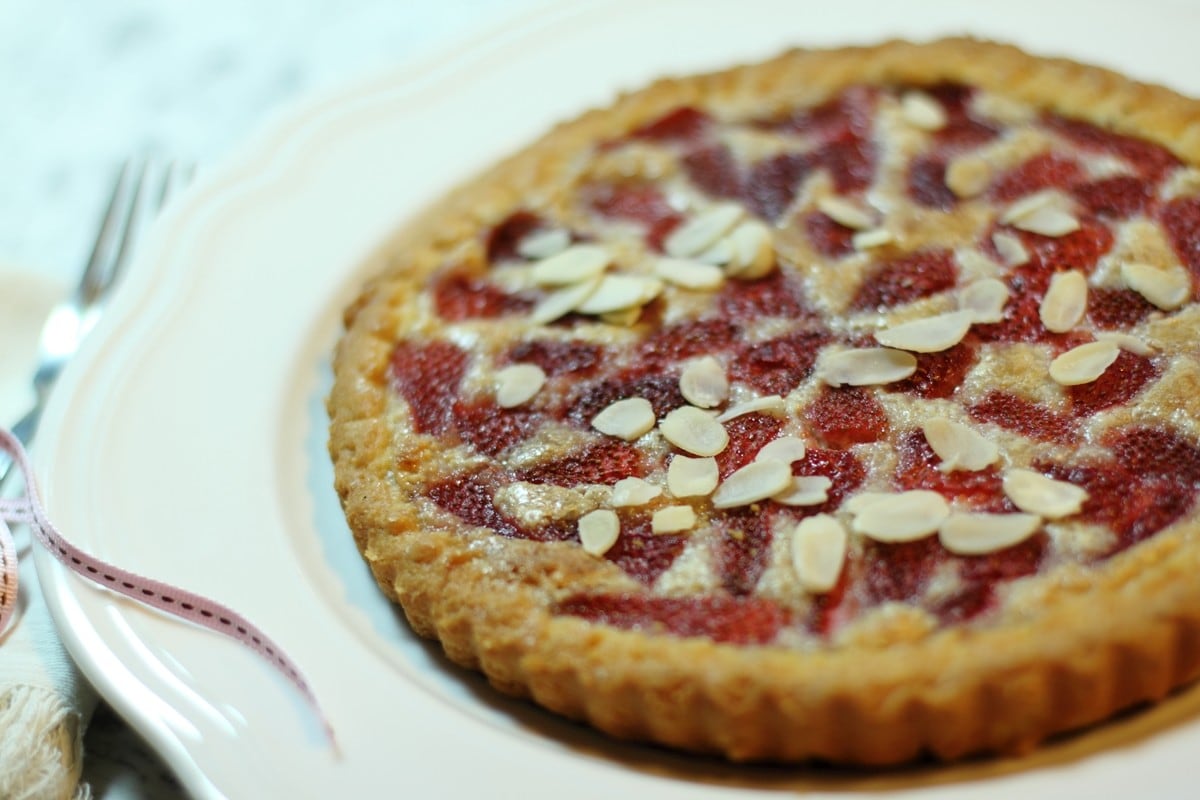 Tagliare le fragole a spicchi e coprire tutta la superficie premendo un po’ sulla crema per farle affondare leggermente. Spolverizzare con zucchero di canna e cuocere in forno a 180° per 40 minuti.