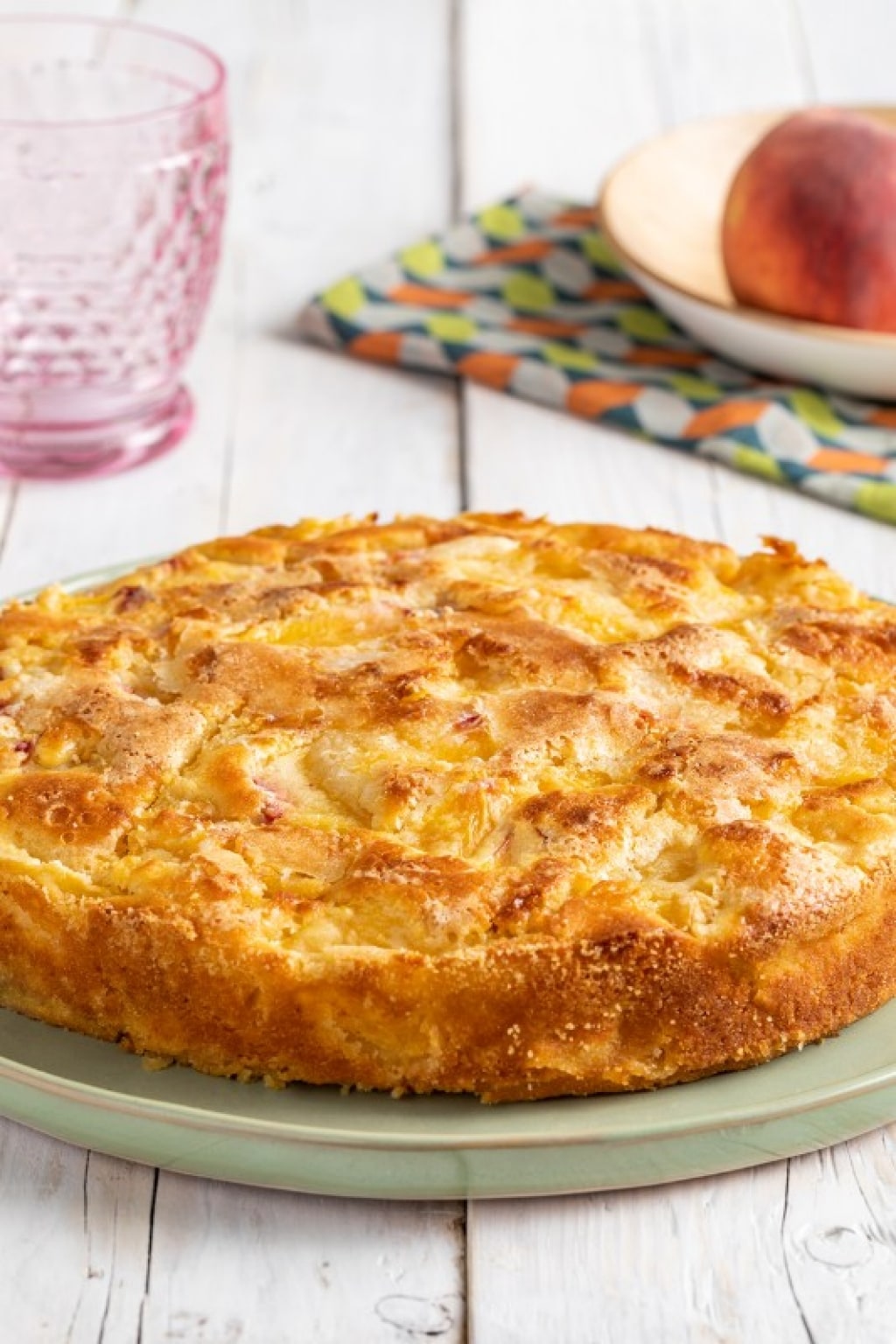 Ponete in forno caldo a 180° e cuocete fino a doratura della superficie. Ritirate, lasciate riposare alcuni minuti, trasferite la torta di pesche sul piatto da portata.