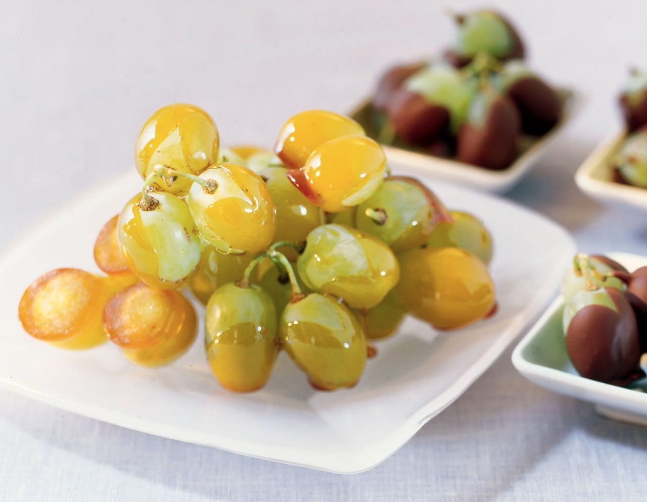 Dividete il grappolo in tanti rametti contenenti pochi acini ciascuno. Lavateli, asciugateli. In un pentolino sciogliete a fiamma bassissima lo zucchero in tre-quattro cucchiai di acqua fredda e, sempre mescolando, preparate il caramello. Immergete l’uva nello sciroppo, ritiratela subito e appoggiatela su un piatto da portata spennellato d’olio di mandorle. Lasciate solidificare bene e servite.