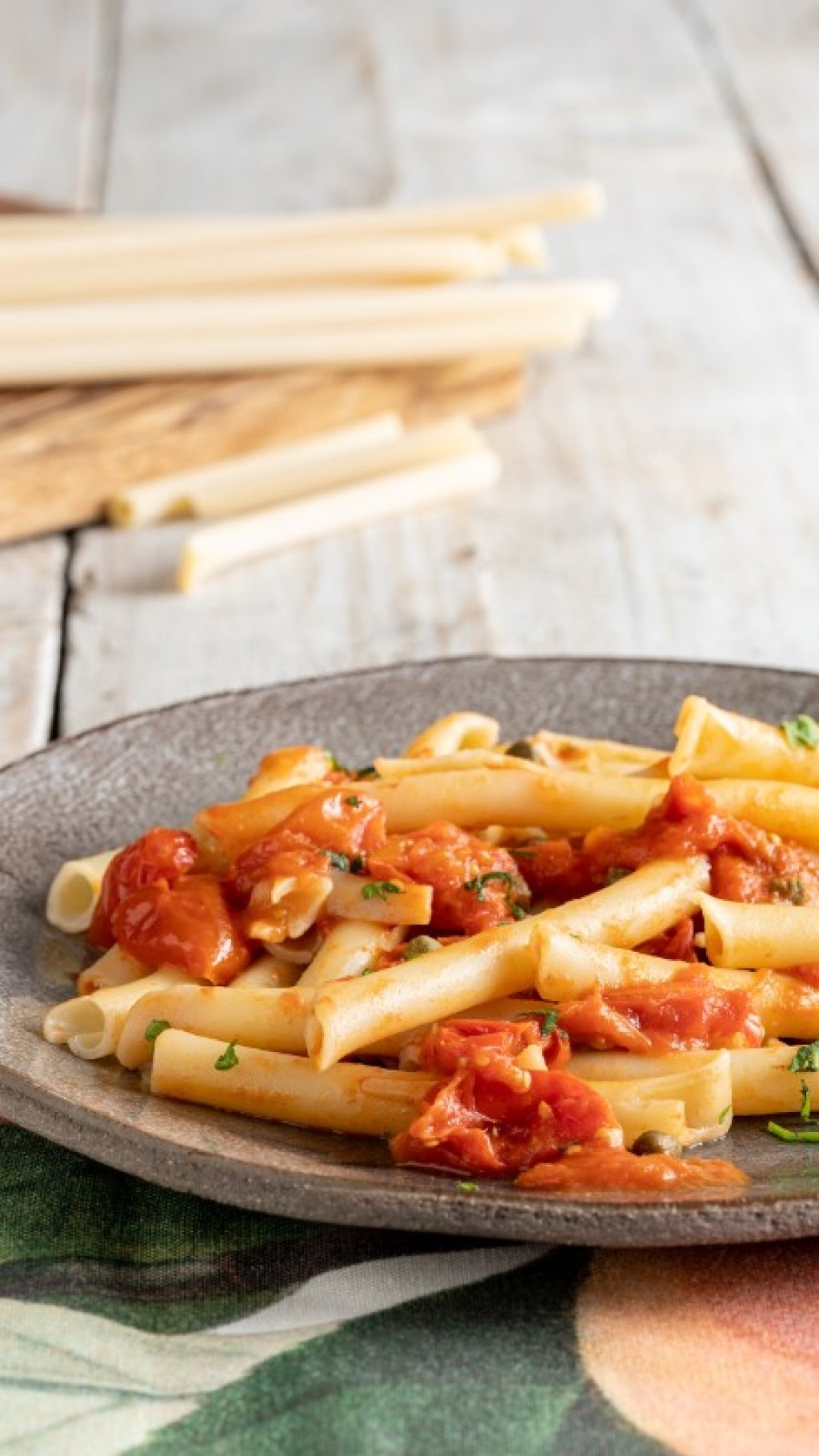 Un primo piatto di pasta veloce e con pochi ingredienti. Pomodorini, capperi e acciughe per condire un formato di pasta partenopeo che, tradizionalmente, si spezza con le mani prima di cuocerlo.