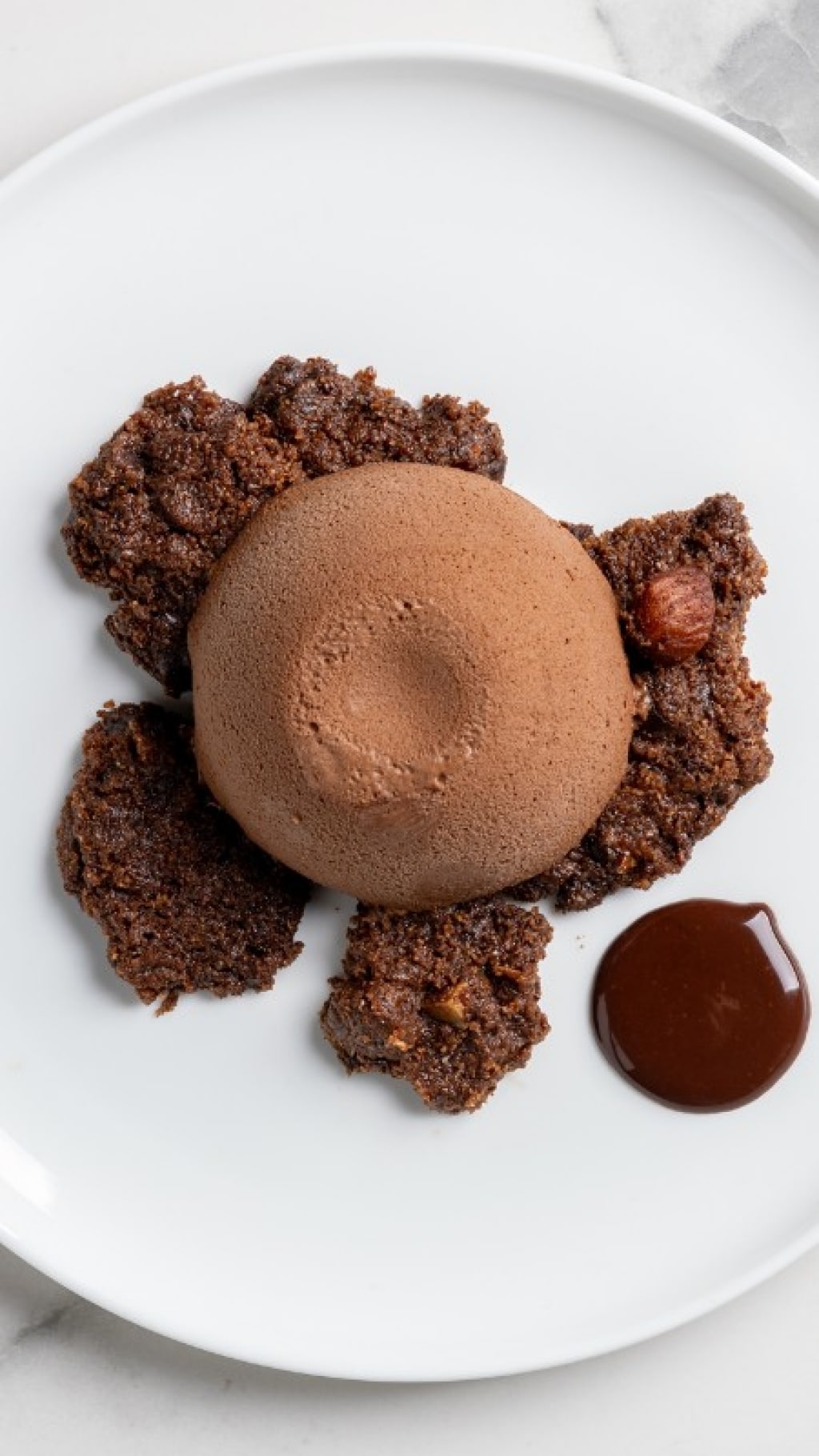 A riposo ultimato, e circa un quarto d'ora prima di servirli, sformate i semifreddi al cioccolato e adagiateli su un piatto con del crumble al cioccolato (o dei biscotti sbriciolati) e della salsa al cioccolato.