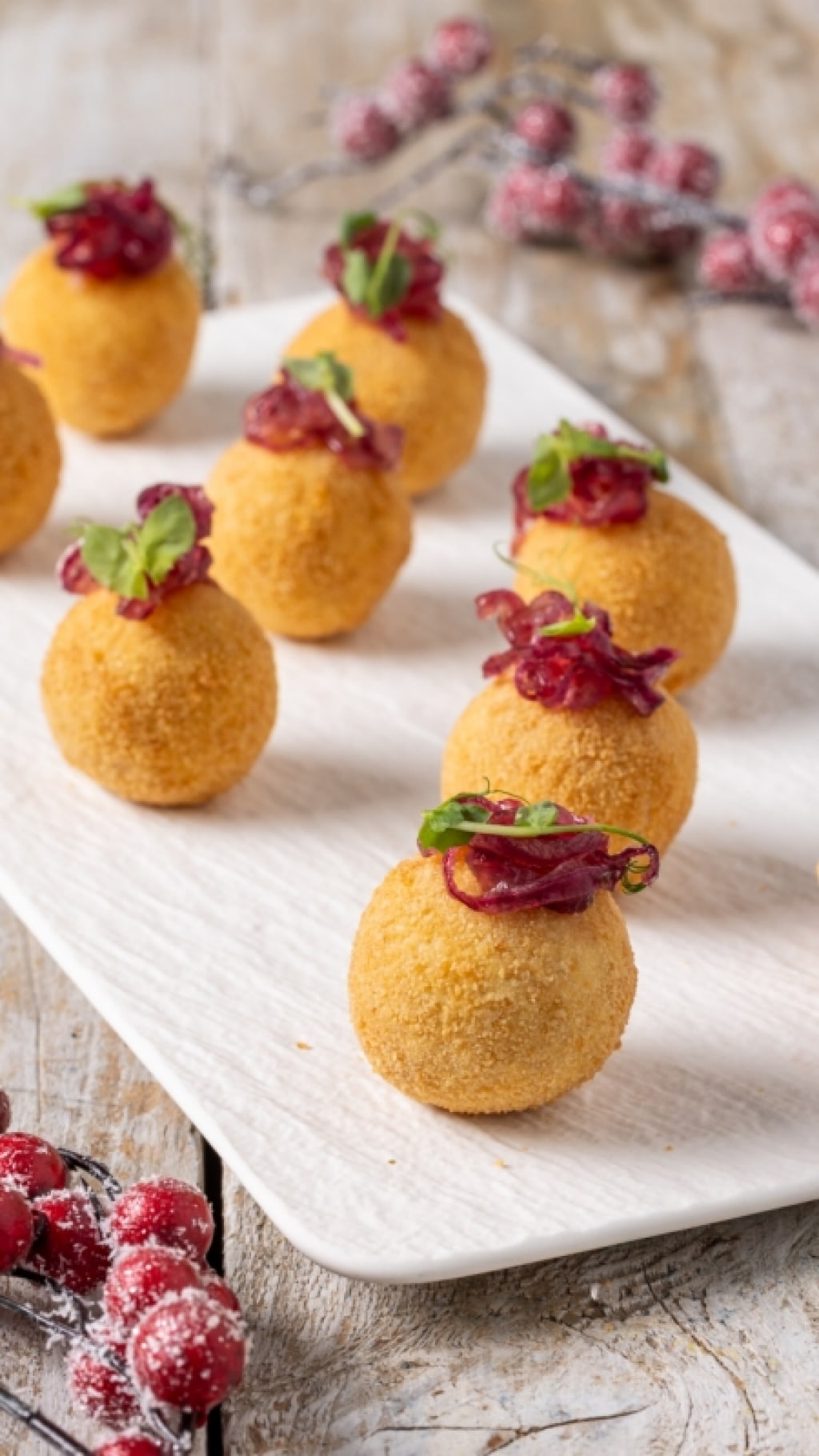 Queste sfere di besciamella al Grano Padano fanno parte di un viaggio di sapori ispirato al percorso dei Giochi Olimpici e Paralimpici Invernali Milano Cortina 2026, che attraversa le regioni della Lombardia, del Trentino e del Veneto. Questa ricetta ci porta in Veneto con la sua tipica cipolla rosa di Bassano.