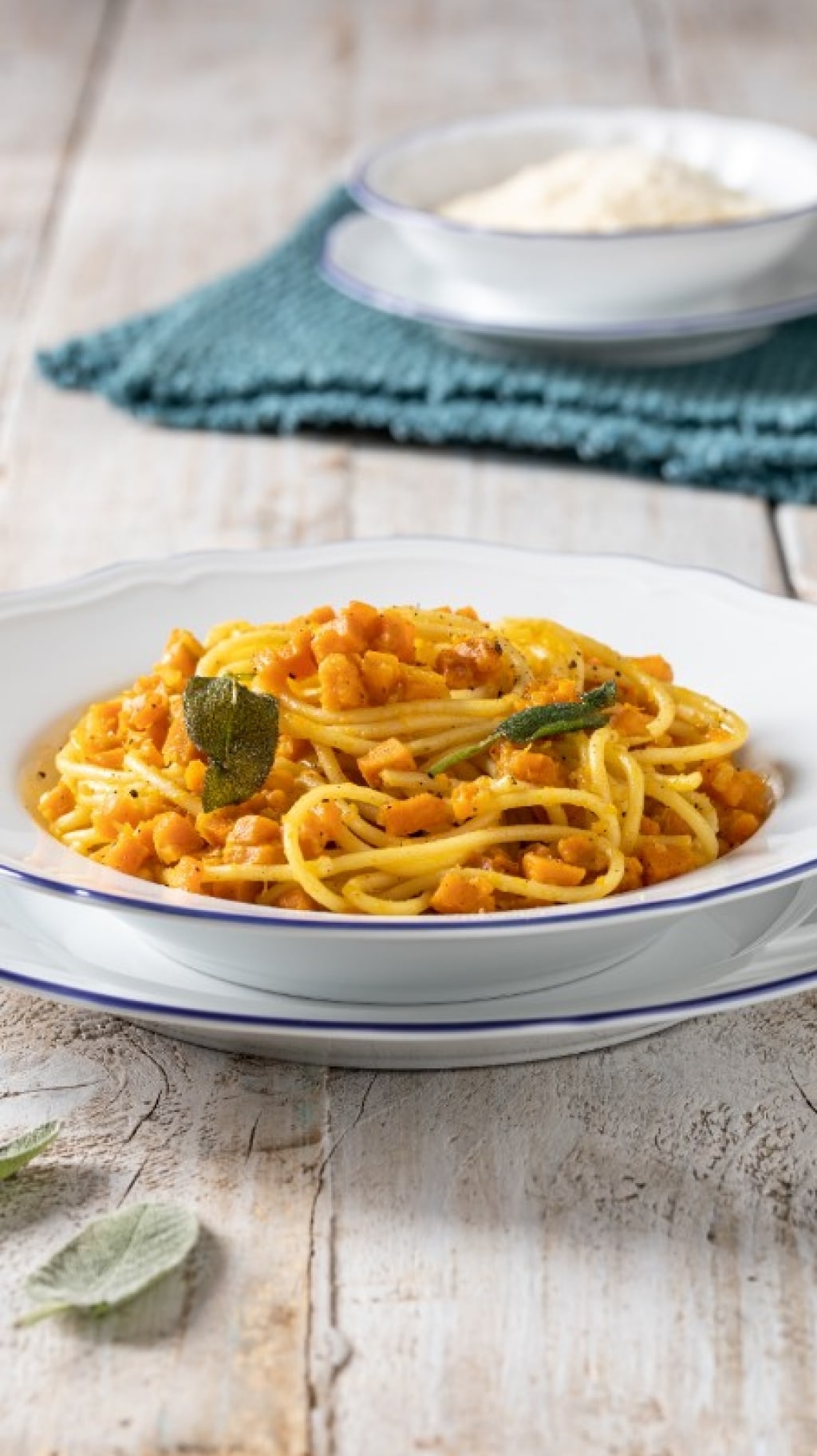 I primi piatti di pasta sono delle ricette versatili e passepartout che si adattano a molteplici occasioni. Non fanno eccezione questi spaghetti al ragù di zucca, dal condimento gustoso e facile da preparare, completamente vegetariano.
