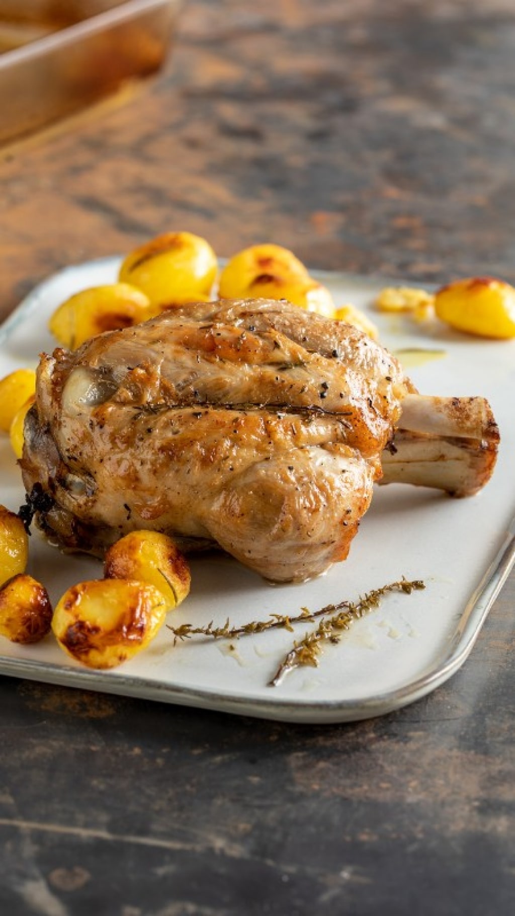 Trasferitelo in una pirofila da forno e irrorate con il vino bianco. Mettetelo nel forno già caldo a 200° e fatelo cuocere per 50 minuti, controllandolo e girandolo di tanto in tanto. A metà cottura aggiungete qualche rametto di timo.