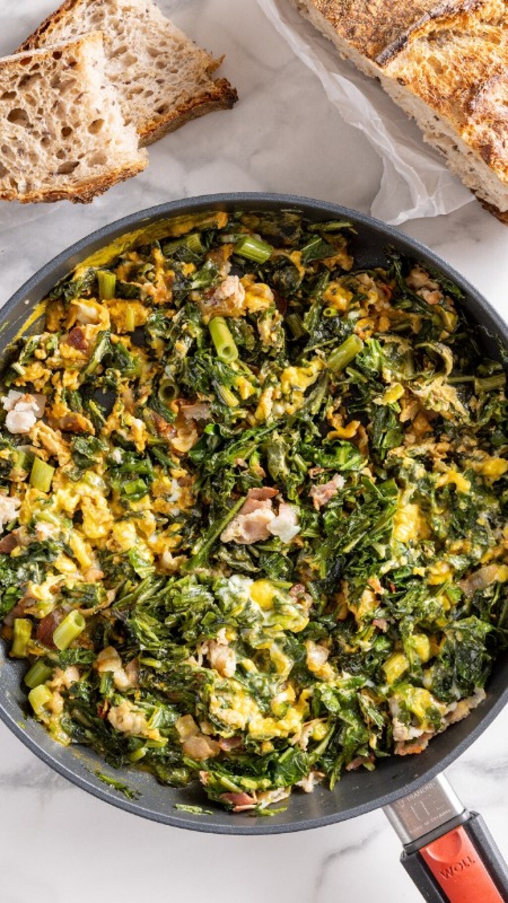 Raggiunta la consistenza desiderata togliete dal fuoco, unite i pezzeti di bacon croccante tenuti da parte e servite subito il tarassaco con uova strapazzate in padella.