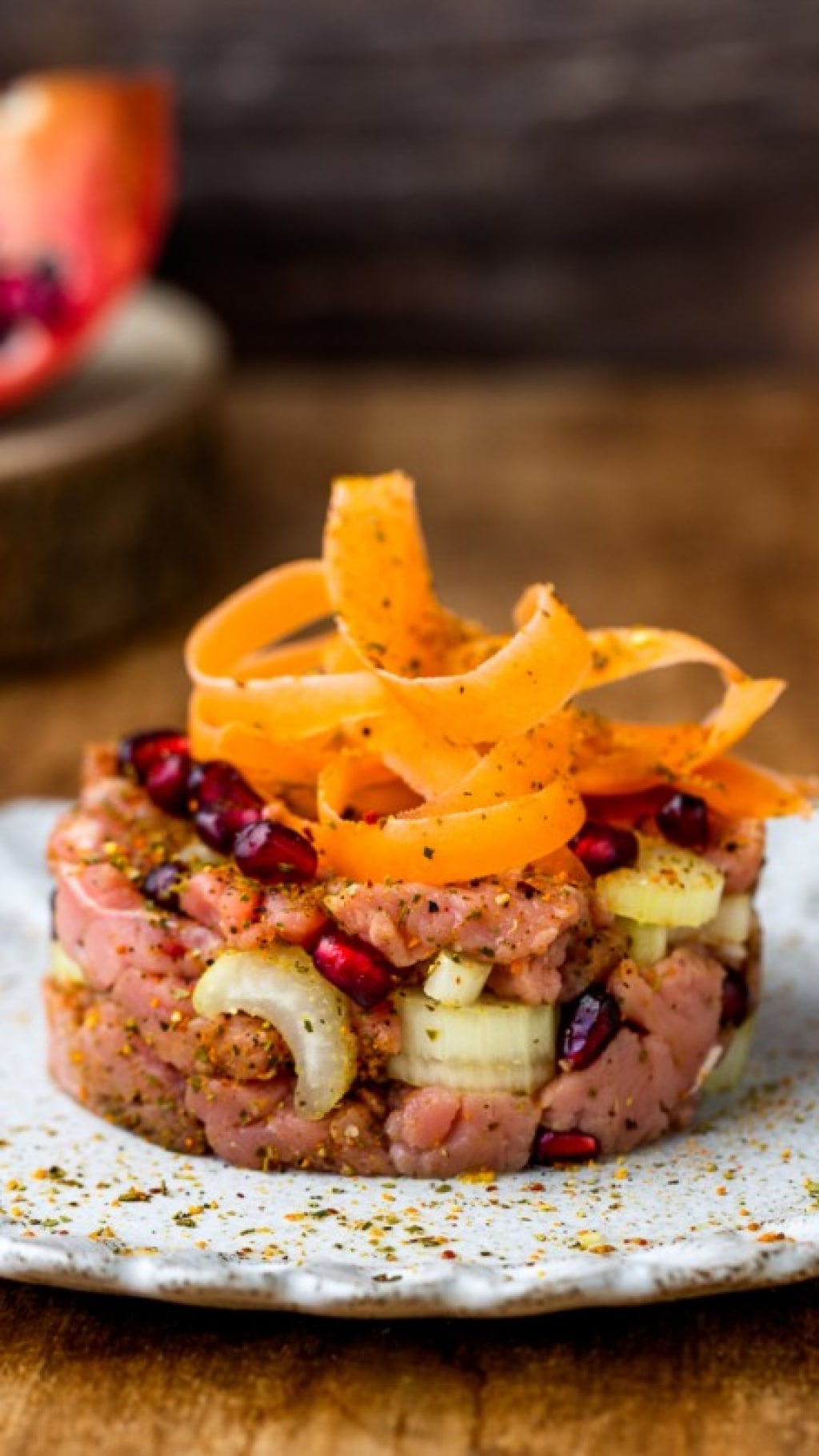 Per chi ama la carne cruda questa è una ricetta da provare, adatta a tutte le stagioni. In questo caso l'abbiamo arricchita con la melagrana, per una nota invernale, ma non perderà se realizzata quando questo frutto non è di stagione. Per la curcuma, vi suggeriamo di utilizzarne solo un pizzico, o la nota dolciastra sovrasterà gli altri sapori.