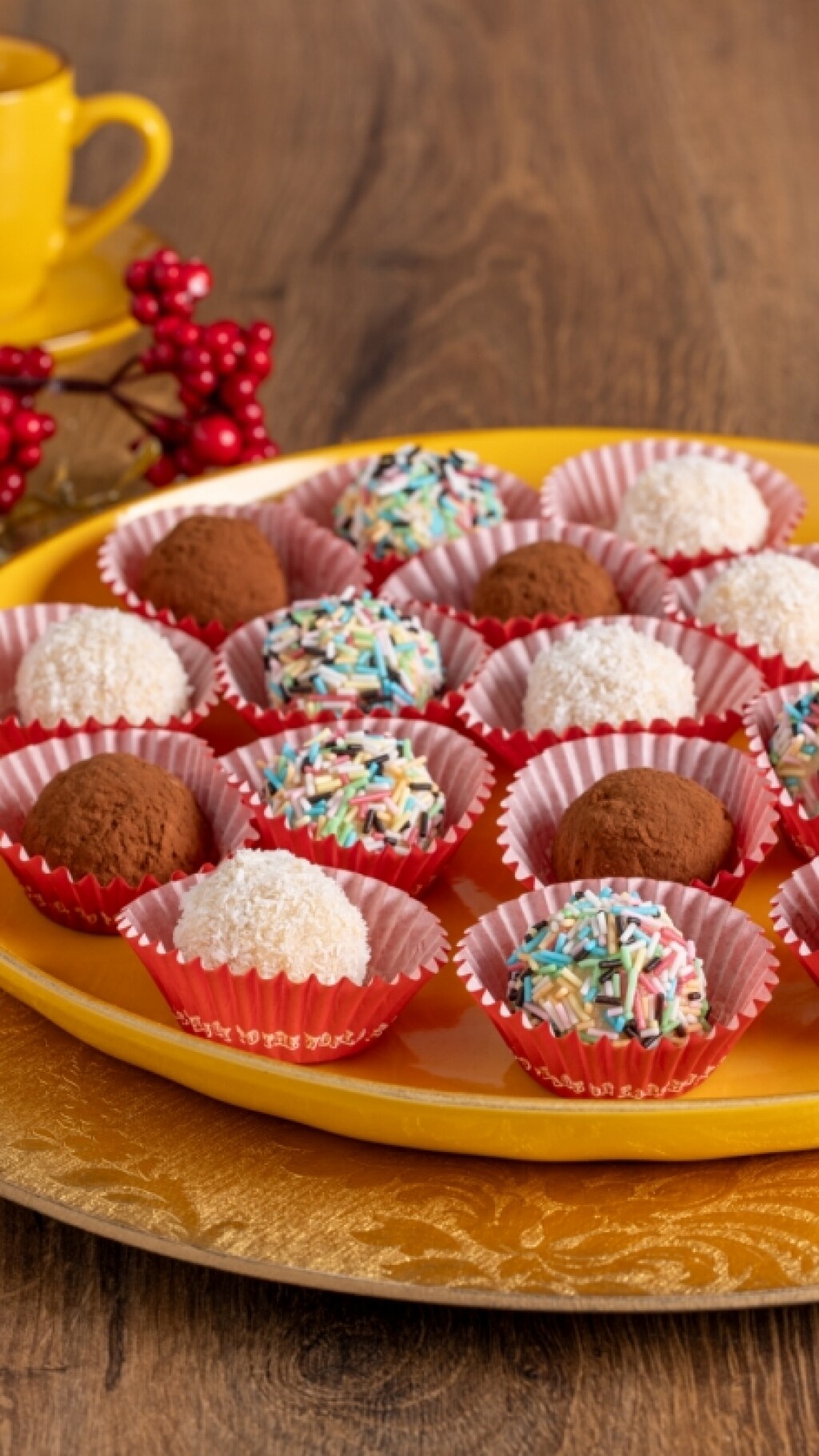 Mettete i vostri tartufini nei pirottini colorati, intervallando le decorazioni, e serviteli su un piatto da portata.