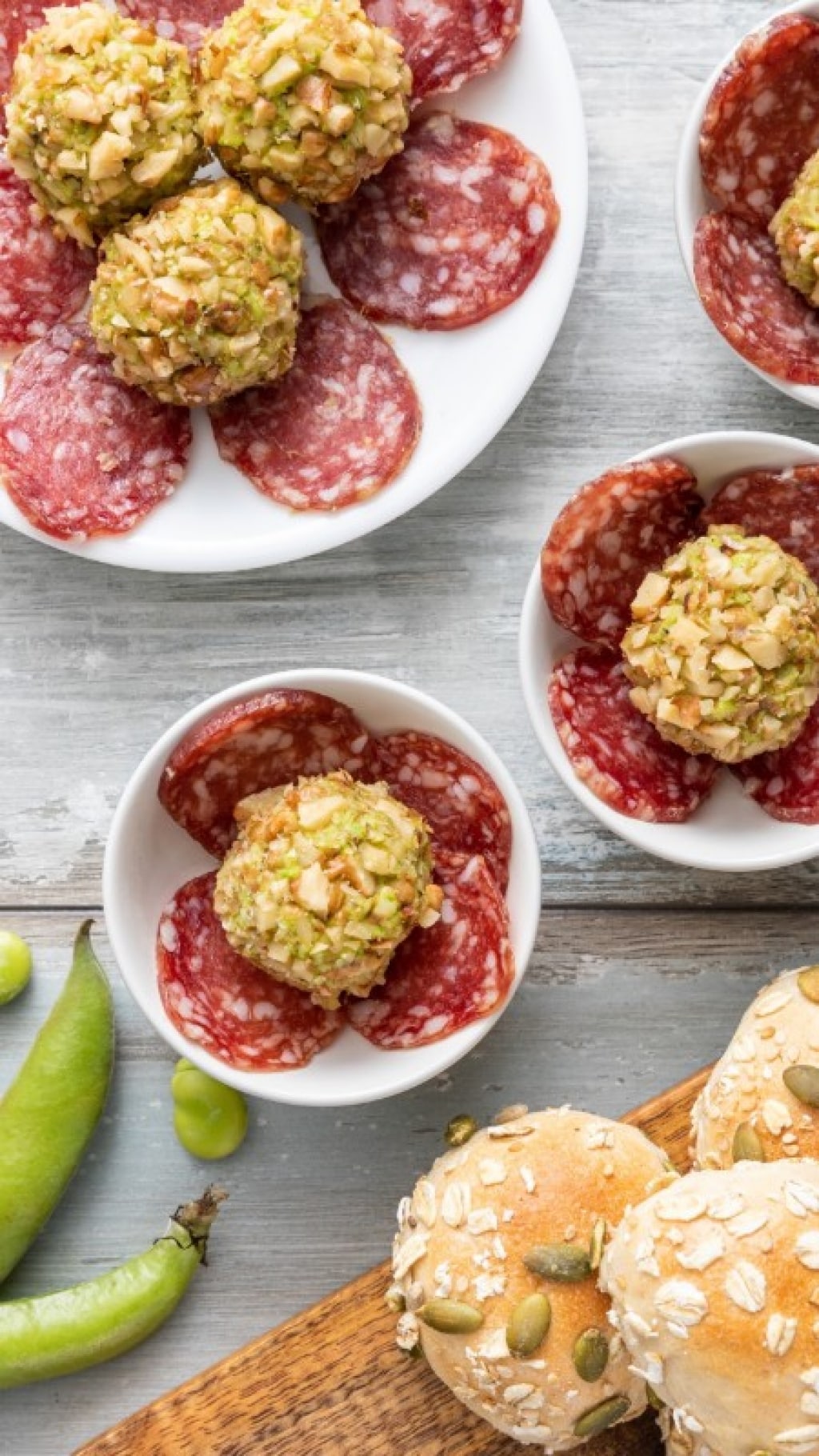 Il procedimento è molto semplice: le fave sbollentate, frullate e poi amalgamate al pecorino vengono rotolate nella granella di noci e poi posizionate al centro di monoporzioni rivestite con sottili fette di salamino a mo' di fiore.