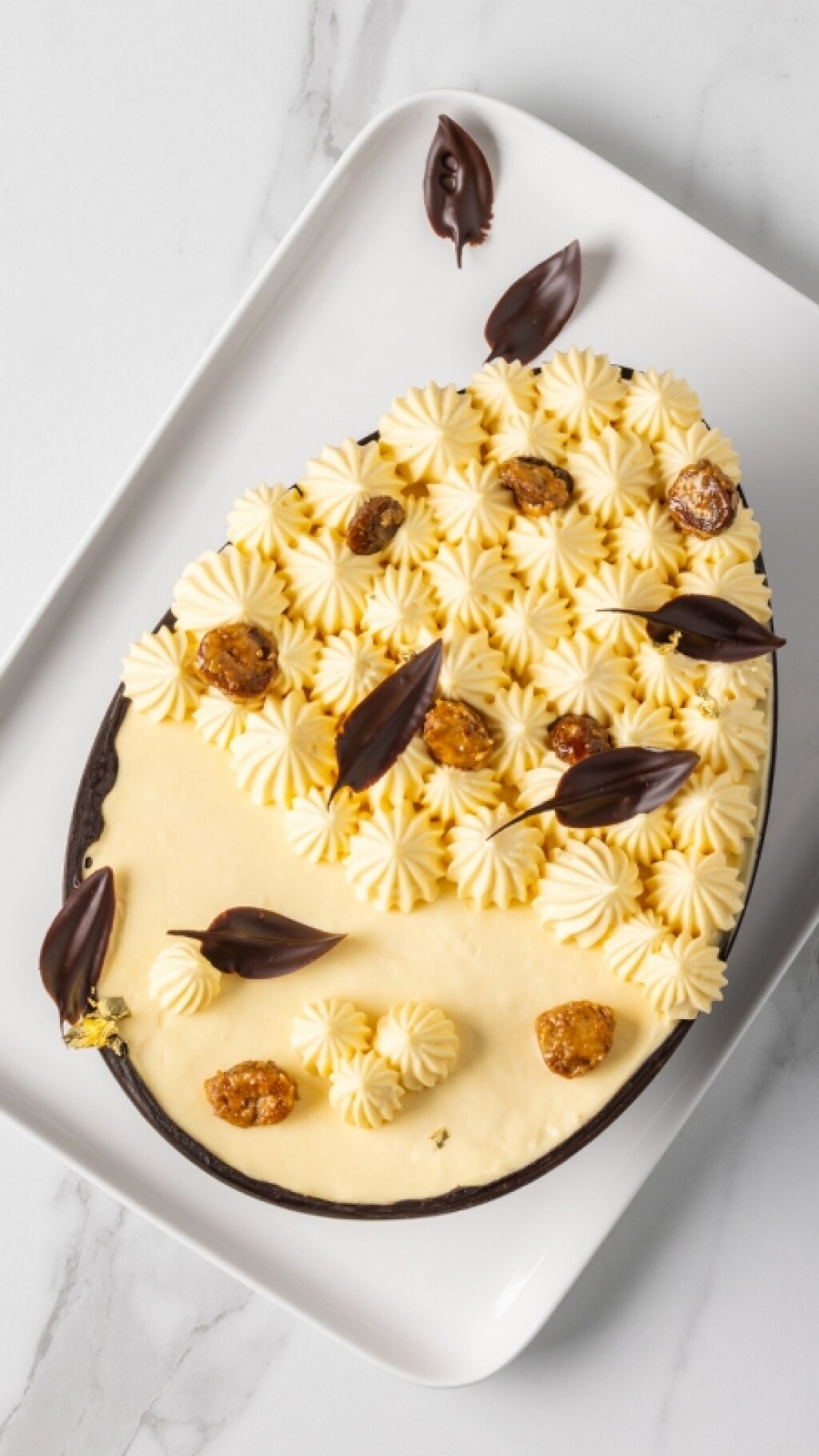 Assemblate il dolce. Sistemate l’uovo di cioccolato su un tagliere, apritelo delicatamente a metà con un coltello. Farcitelo con uno strato di crema al mascarpone alla base.