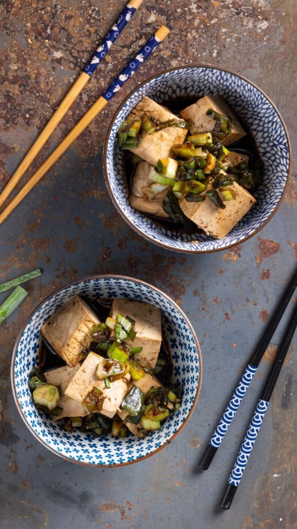 La marinatura che vi proponiamo è la più semplice e basilare: salsa di soia e cipollotto fresco, un mix che rende il tofu molto stuzzicante. Lasciatelo a riposo da un minino di 30-40 minuti fino a un massimo di 4-5 ore, in base a quanto lo gradite sapido e intenso.