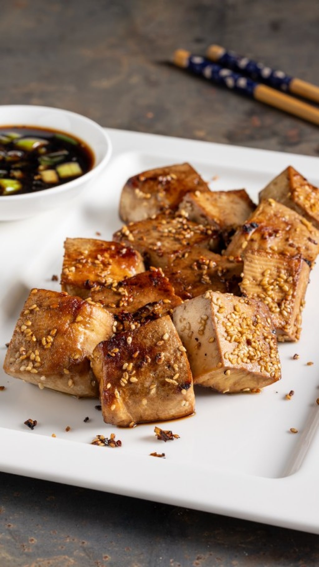 La marinatura in salsa di soia e cipollotto conferisce al tofu un sapore deciso e appetitoso e i semi di sesamo aggiungono una nota tostata, come di frutta secca, deliziosa.