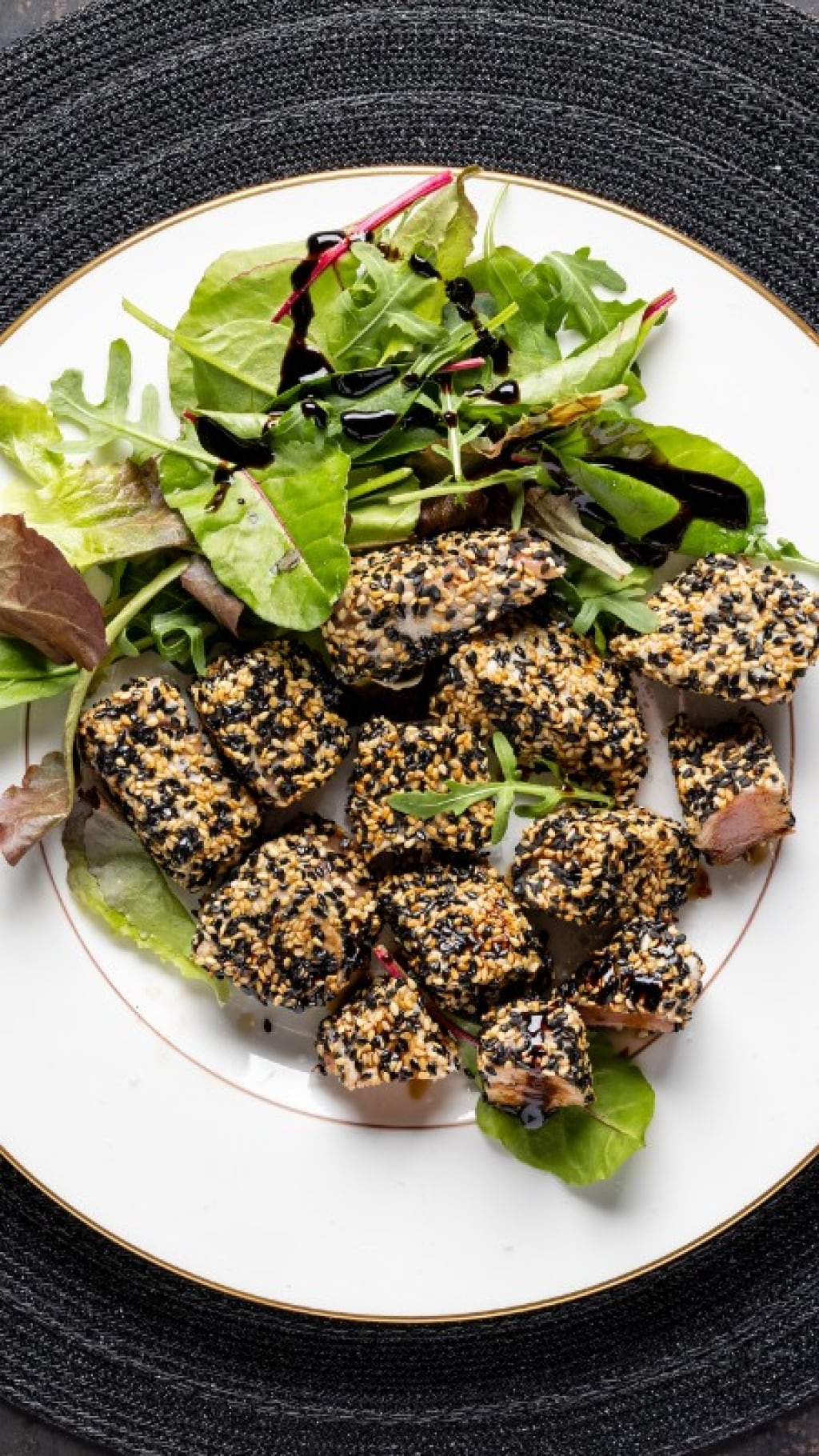 Scaldate una padella antiaderente con un filo di olio e, quando sarà ben calda, cuocete i cubetti di tonno per circa 1 minuto per lato. Potete regolare il tempo di cottura in base allo spessore del tonno. Servite il tonno al sesamo con un pizzico di sale di Maldon e pepe a piacere, un'insalatina fresca e qualche goccia di aceto balsamico di Modena IGP alta densità.
