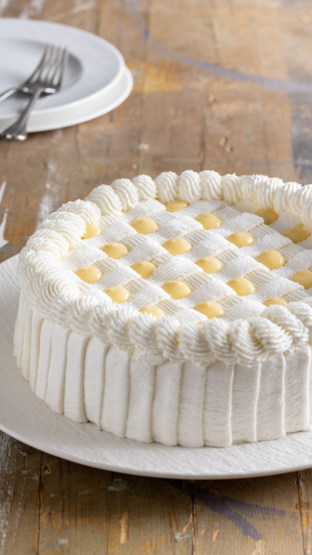 Rivestite di panna i lati della torta aiutandovi con la spatola per creare un motivo a gradini (come da immagine). Decorate la superficie con motivo a finta griglia (utilizzando la bocchetta zigrinata) e il bordo esterno con una ghirlanda di panna a ciuffi.