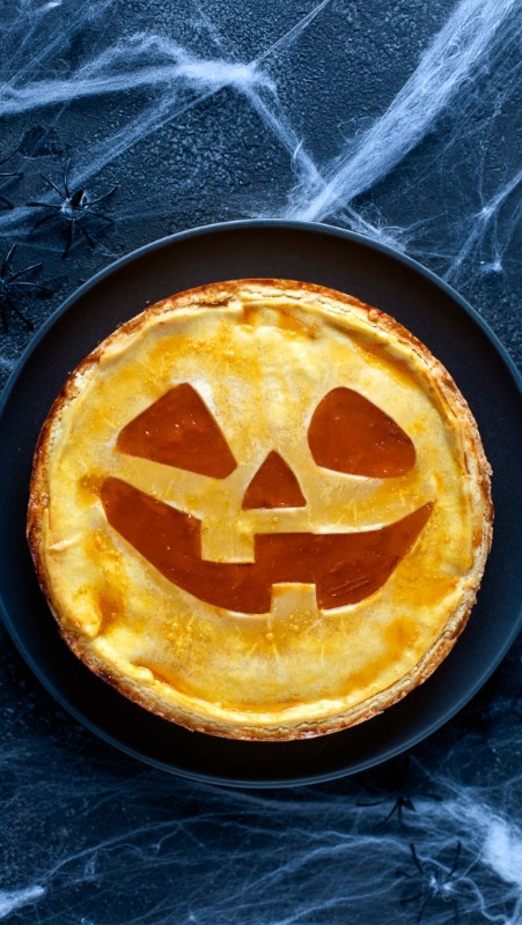 Livellate e stendete la pasta brisée restante in un disco dello spessore di 5 mm e del diametro della teglia. Disponetelo sul ripieno alla zucca e fate pressione lungo i bordi in modo da saldarli. Con un coltellino intagliate gli occhi, il naso e una bocca. Qualora la pasta dovesse esser difficile da tagliare perché fuori temperatura il consiglio è quello di mettere la pie in freezer per 30 minuti e di procedere all’intaglio. Spennellate con l’uovo sbattuto e cuocete nel forno già caldo a 180° per 45 minuti o fino a doratura della pasta.