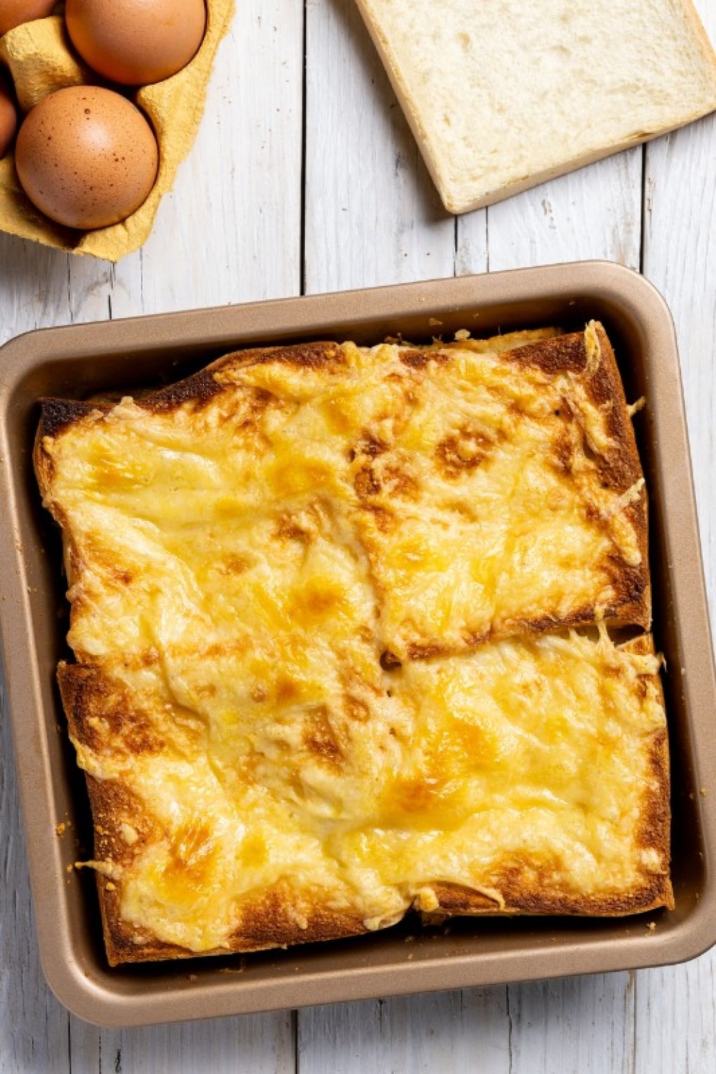 Una base di pancarré, un condimento di formaggi saporiti e un altro strato di pane in chiusura, il tutto irrorato da un mix di panna, uova, brodo e vino e ricoperto con altro formaggio. Una piccola "bomba" di gusto!