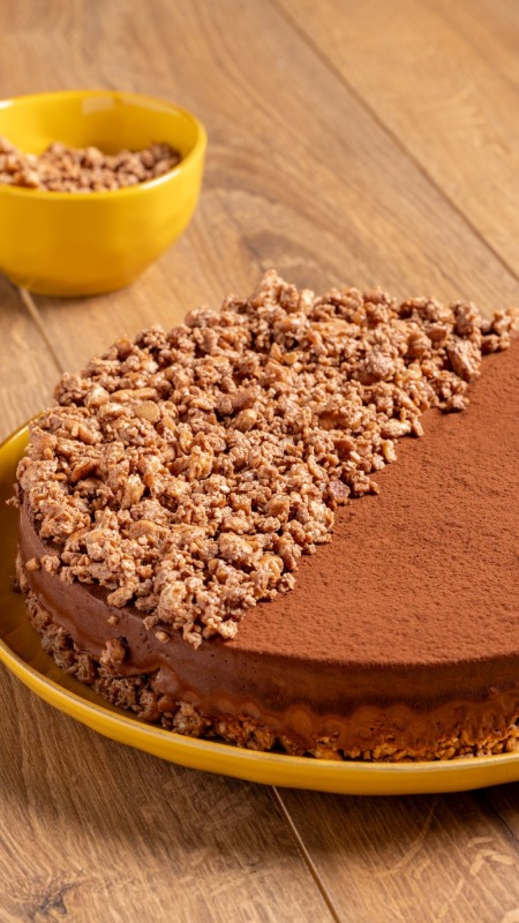 La base croccante è una sorpresa: i biscotti vengono mescolati al cioccolato fuso e all'olio di semi per uno strato crunchy ma comunque leggero. Il tocco speciale è dato dalla nota sapida dei fiocchi di sale che ben contrasta il dolce degli altri ingredienti ed è totalmente inaspettata.