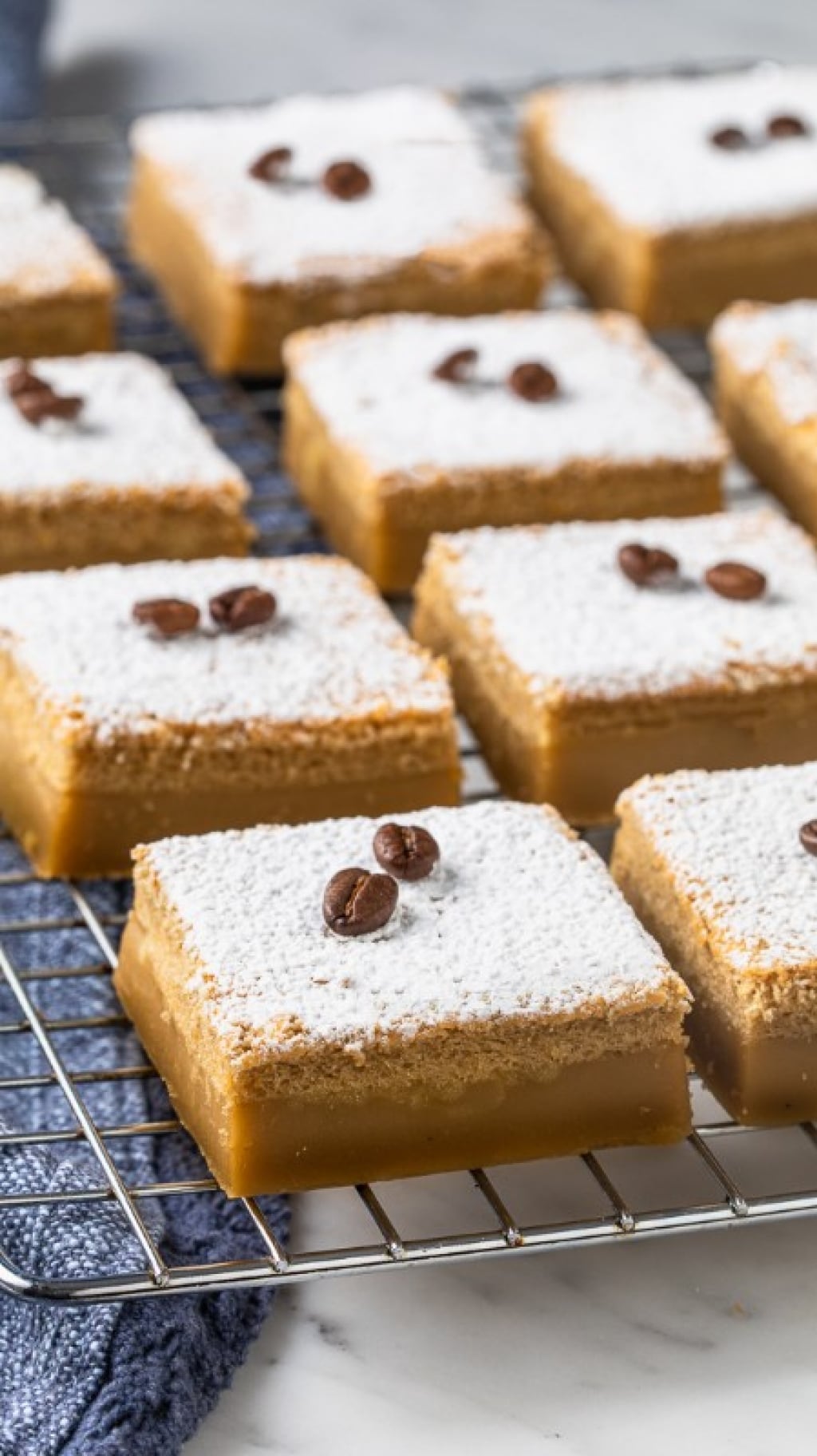 Si tratta della versione aromatizzata al caffè di una torta che è nata e si è diffusa sul web da ormai qualche anno, la torta magica appunto. Quadrotti spolverati di zucchero a velo e guarniti con chicchi di caffè, da gustare come dessert o come dolcetto per una pausa golosa.