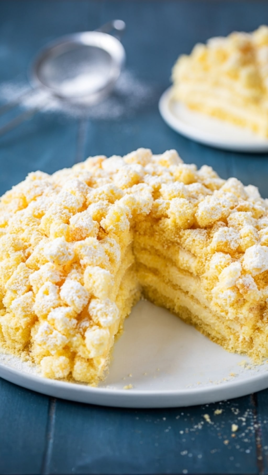 Distribuite i cubetti su tutta la superficie e lungo i bordi della torta mimosa, facendoli aderire delicatamente con le mani per ottenere l’effetto soffice e voluminoso tipico del dolce. Una volta completata, trasferite la torta in frigorifero e lasciatela riposare per almeno 4 ore, meglio ancora tutta la notte. Questo tempo di riposo permetterà ai sapori di amalgamarsi e alla struttura di stabilizzarsi perfettamente. Prima di servire, potete completare la torta mimosa con il Bimby con una leggera spolverata di zucchero a velo.