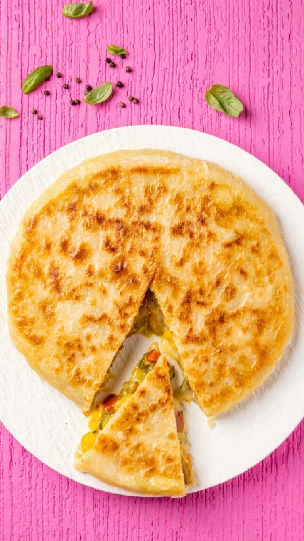 Cuocete la torta salata in una padella già calda su uno strato di carta forno, mantenendo una fiamma media, finché sarà dorato – ci vorranno circa 6 minuti – poi aiutandovi con la carta forno e un coperchio, girate la torta per completarne allo stesso modo la cottura dall’altro lato.
