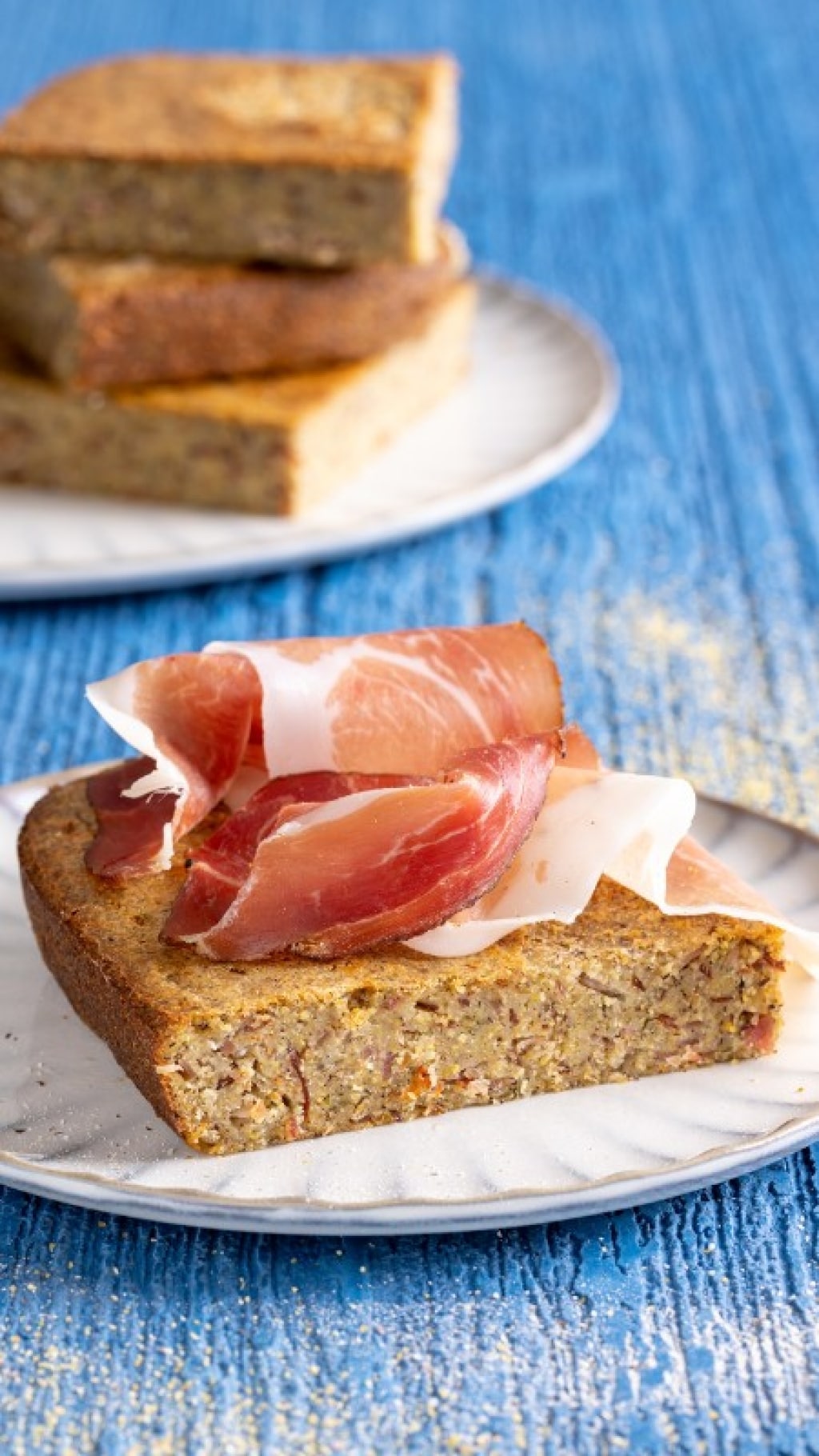 Sfornate la torta senza glutine di grano saraceno e lasciatela riposare qualche minuto. Tagliatela in quattro o più porzioni, guarnitela con qualche fetta di speck se gradite, quindi servitela.