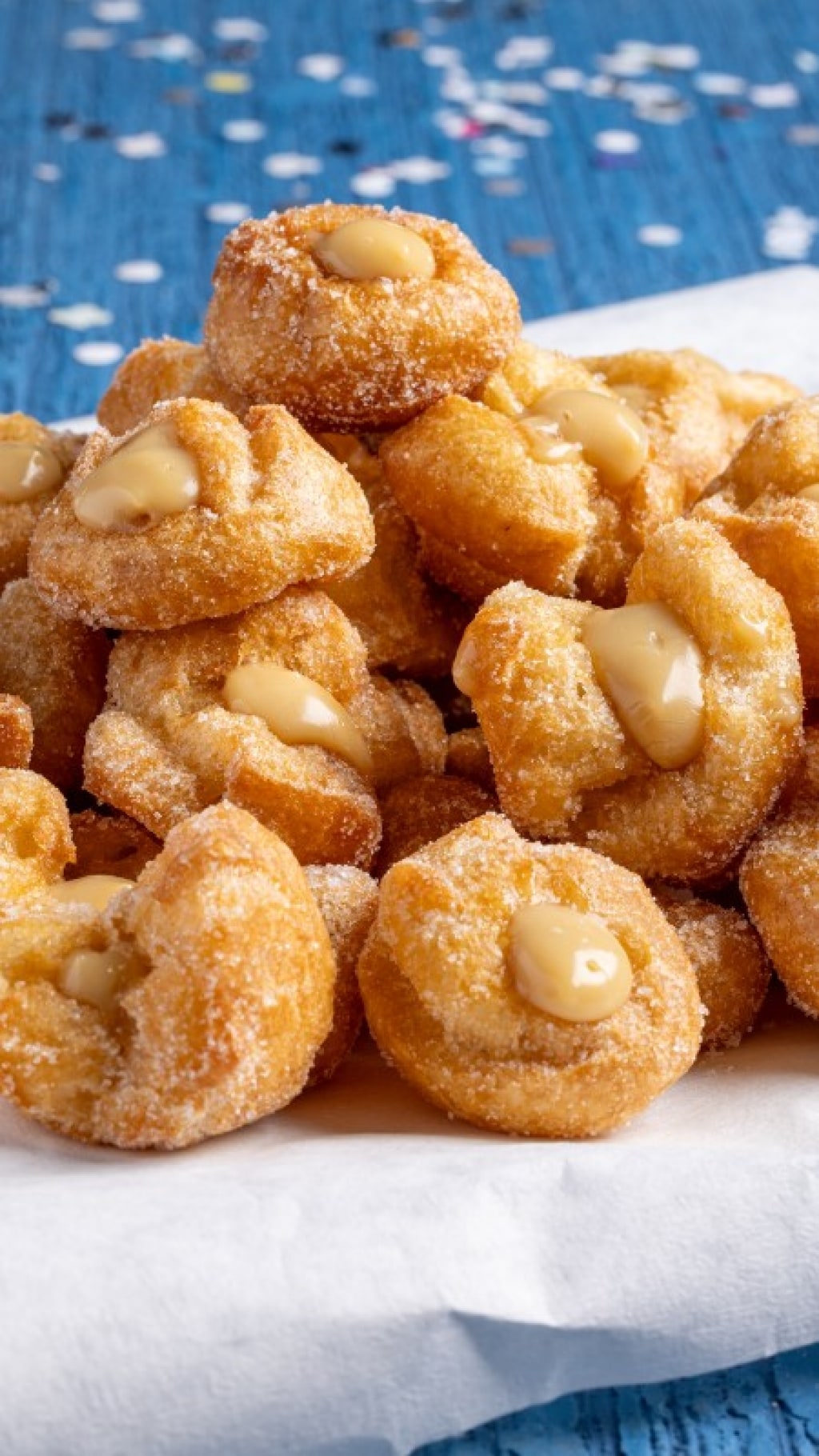 Date forma ai tortelli con la sac à poche, realizzando delle montagnette di impasto su fogli di carta forno. Per cuocerli, dovrete immergere tutto in olio bollente e muovere un po' il foglio di carta: i tortelli si staccheranno da soli, si gonfieranno e si doreranno alla perfezione.
