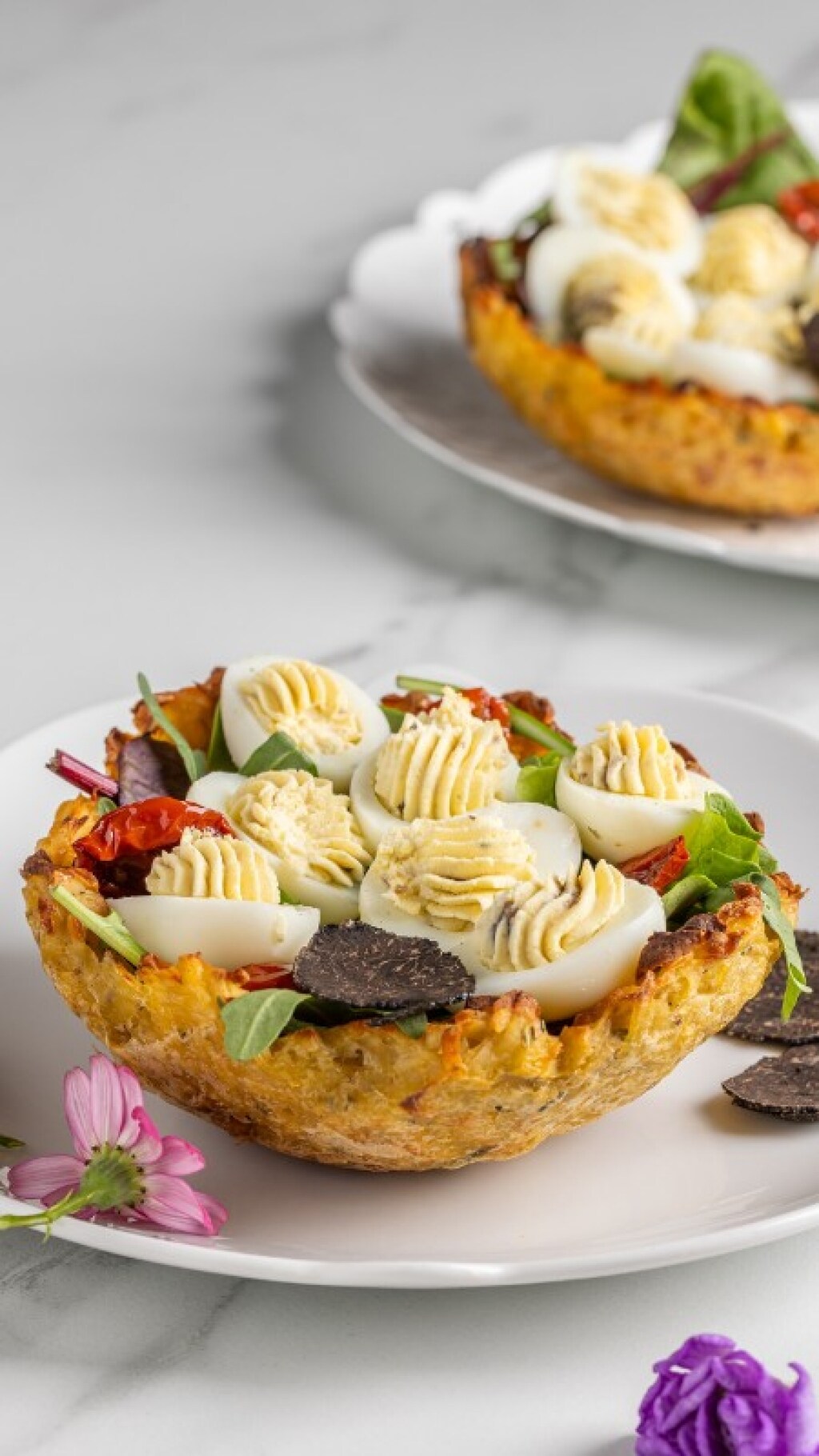 Noi abbiamo realizzato i cestini con l'aiuto di uno stampo di alluminio da zuccotto, ma potete crearli della dimensione che preferite e, perché no, servire le uova farcite anche come piccolo finger food direttamente su un letto di insalata. Il ripieno è così irresistibile che le gusterete una dopo l'altra!