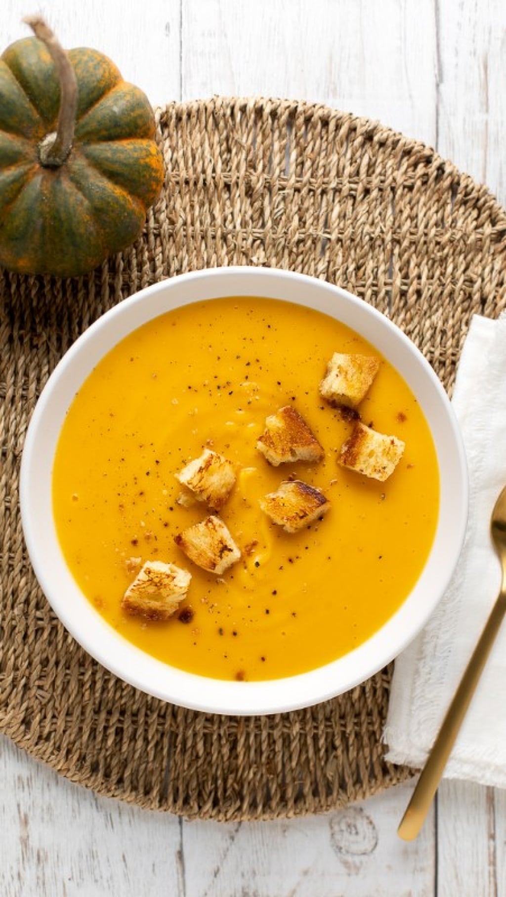 Unite infine la noce di burro e frullate per 40 secondi a velocità 6. Servite la vellutata di zucca e patate calda con dei crostini di pane e una spolverata di noce moscata a piacere.