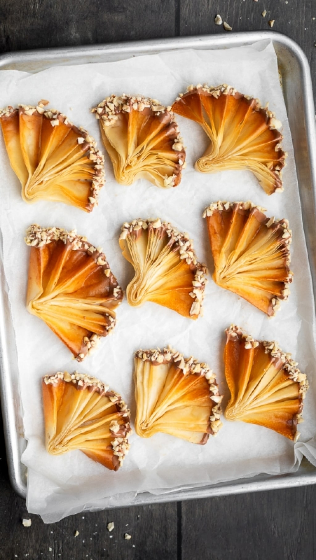 Mentre il cioccolato è ancora fuso passate i ventagli nella granella di anacardi in modo da farla aderire. Sistemate i ventagli di pasta fillo su carta forno e lasciateli asciugare, ed eccoli pronti per essere gustati!