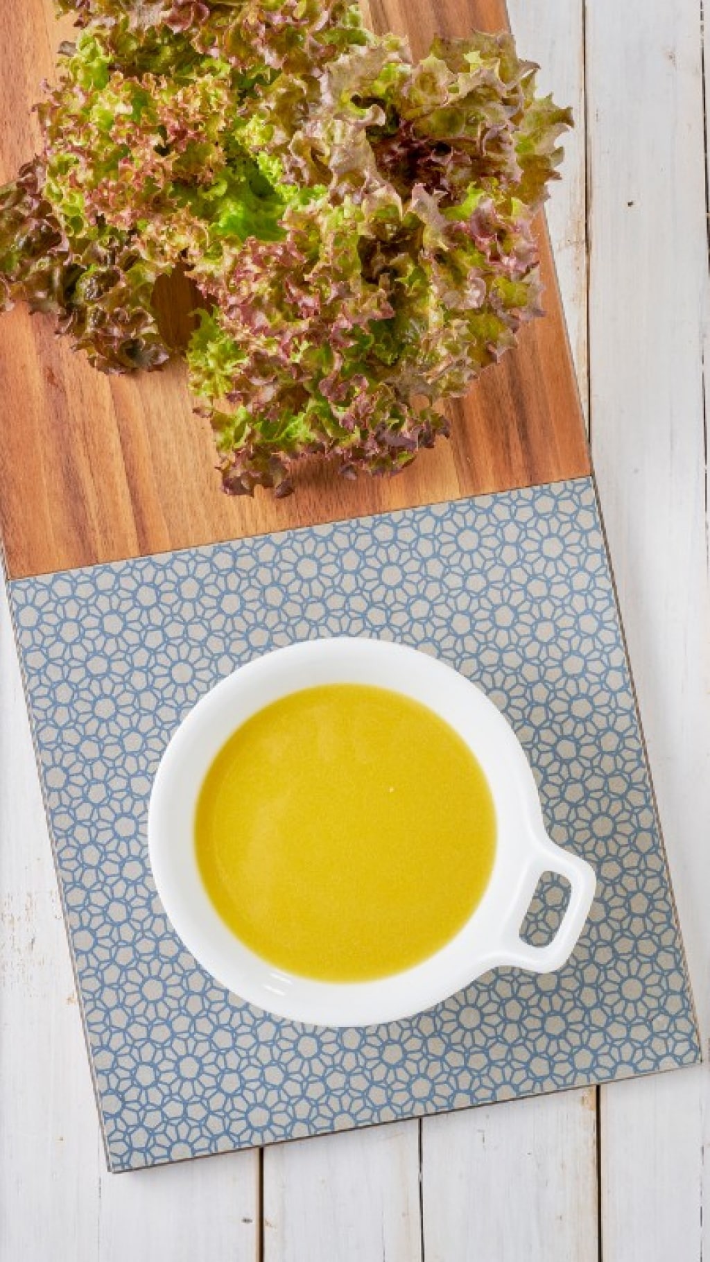 Nel boccale del frullatore a immersione frullate contemporaneamente l'olio, l'aceto, il sale. e la senape Il risultato sarà un'emulsione leggermente opaca.